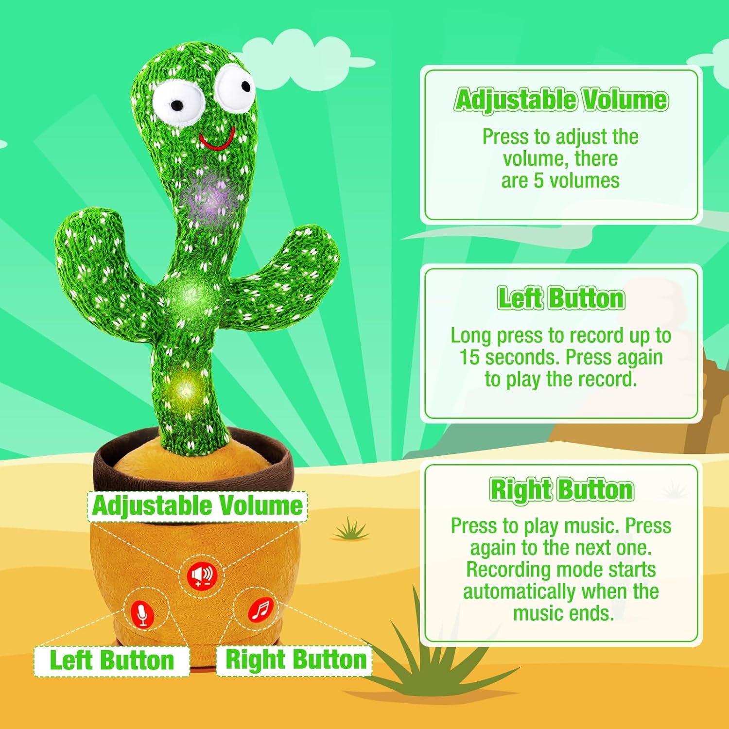 LEARNING TO TALK: The repeating feature encourages kids to talk more to this lovely dancing singing cactus. During the talk and repeat process, kids learn to pronounce, express their own ideas and emotions. Mimicking Recording Cactus Toy is an ideal toy especially for kids with autism or speech delays