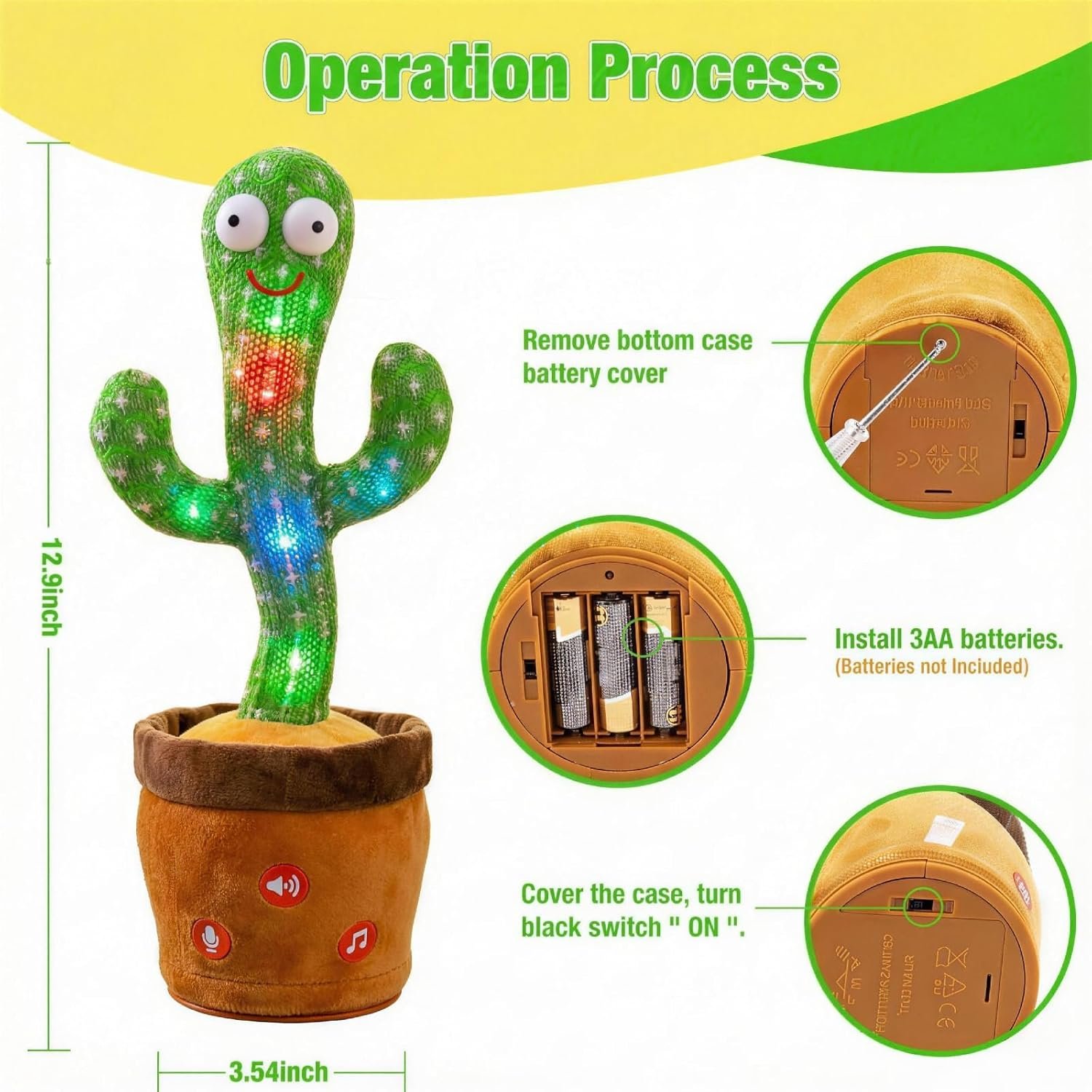 EASY TO OPERATE : Insert 3 AA batteries(NOT INCLUDED) to get this cactus toy to talk and dance. With just 3 buttons, it’s super easy to use. One button for “record and play”, one button for volume control and another for playing and switching songs. Great toy for toddlers, kids, friends, family as birthday gift, easter basket stuffers or party favors. Super easy and fun, suitable for all ages