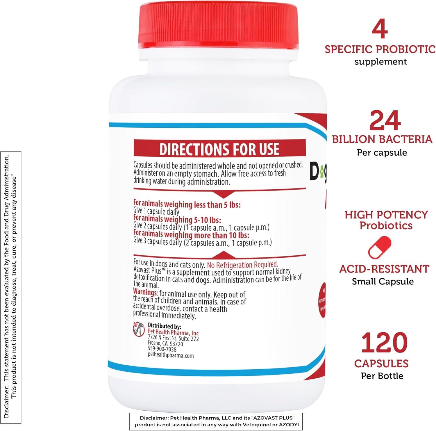 AZOVAST Plus is a nutritional supplement for cats and dogs that reduces elevated levels of urea and other nitrogen compounds in the blood, an increased concentration of compounds that impair the kidneys’ ability to filter and eliminate waste. This effective formula contains S. thermophilus, L. acidophilus, B. longum, L. casei. AZOVAST Plus DO NOT REQUIRE REFREGRATION and do not worry for refrigerator temperatures at all times.