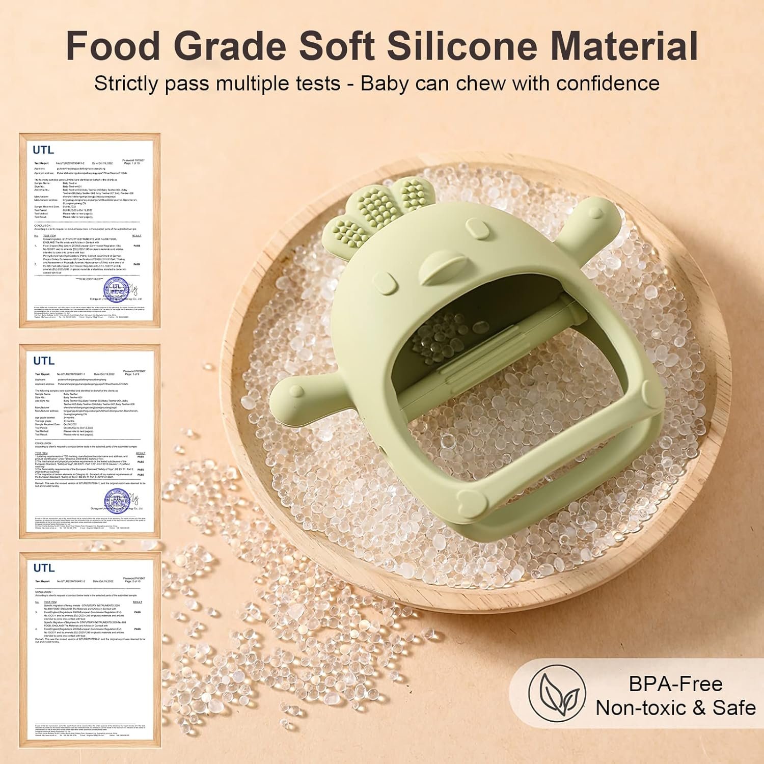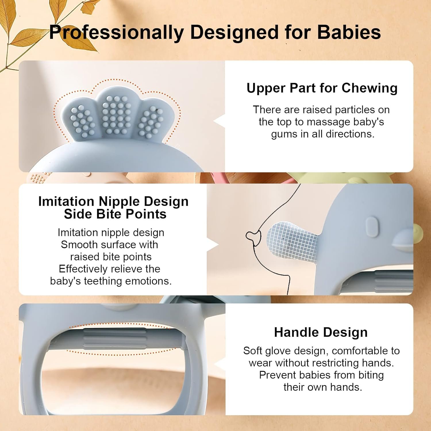 Raised silica gel particles can massage gums and relieve teething pain.