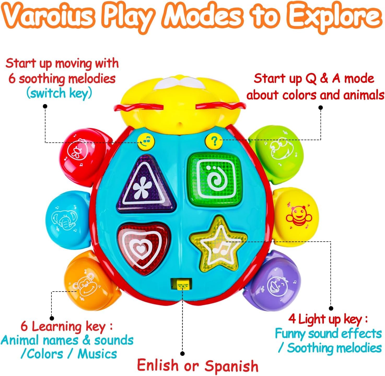 【Baby Toys Bilingual Learning】This baby toys 6-12 months with Spanish and English. Baby can learn different colors, animal names and sounds by pressing “6 legs “( switch key). Pressing the “?”, the interesting Q & A interaction begins. Fun to learn English and Spanish.Musical toys for 1 year old, sensory toys for babies,1 year old boy toys. Great easter toys for babies toddlers 1-3.