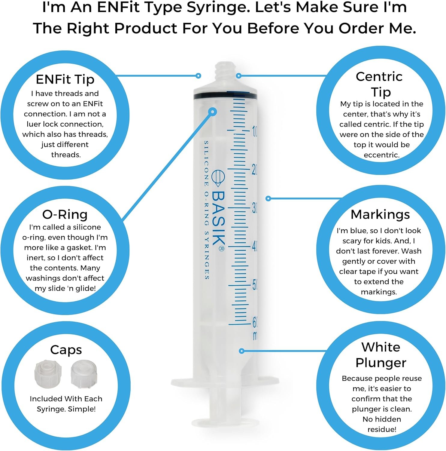 Be the first to review “BASIK 60ml Enteral Feeding Syringe With ENFIT Compatible with Caps | 60cc | Reusable Silicone O-Ring Style | Tube Feeding with Clean Assure White Plunger”