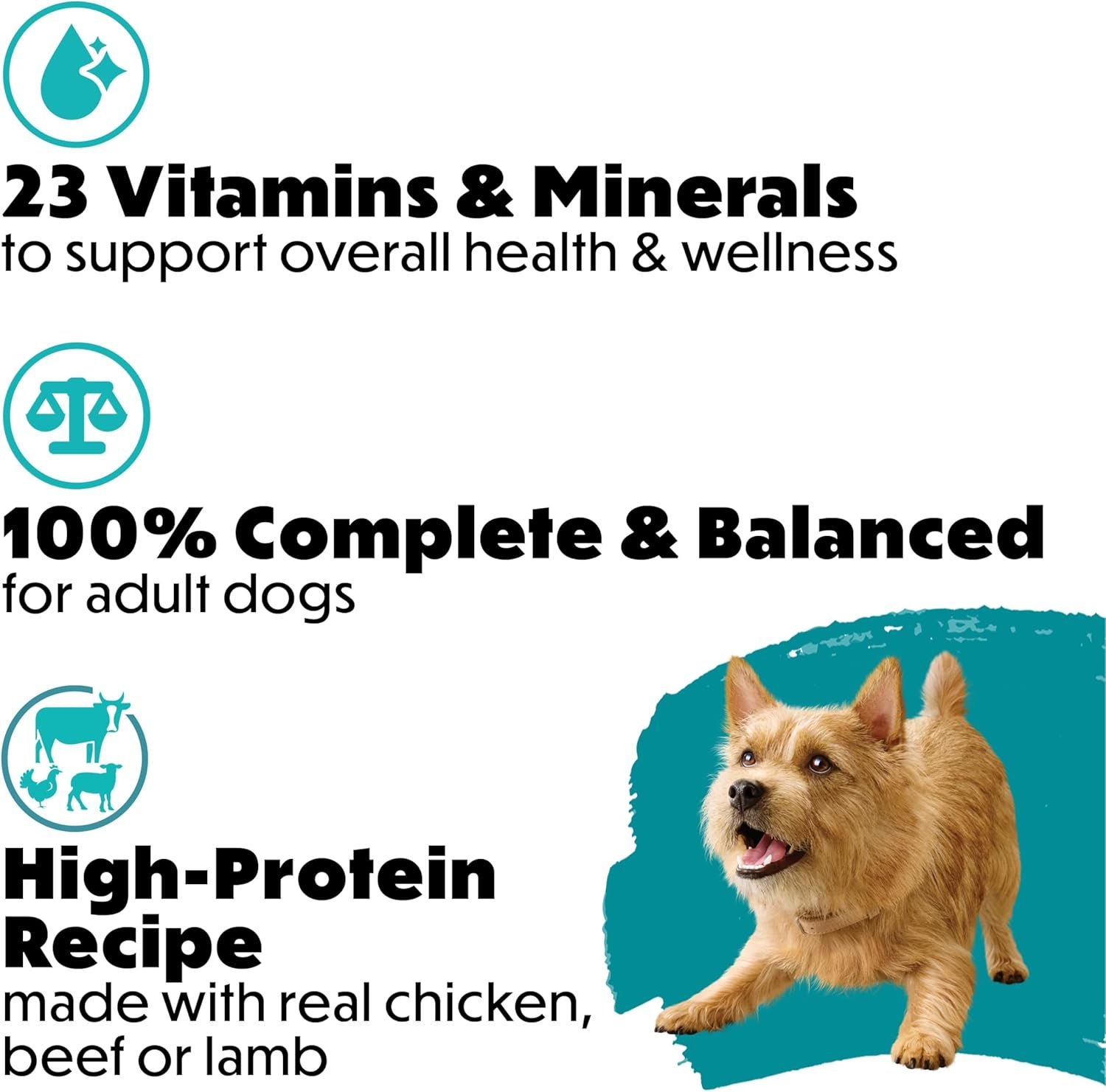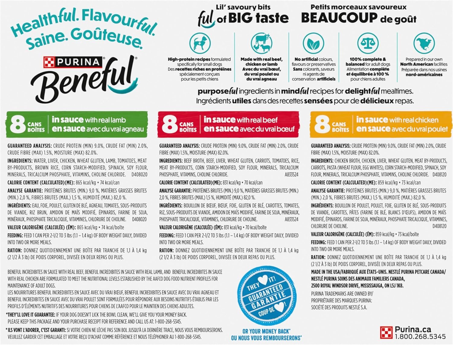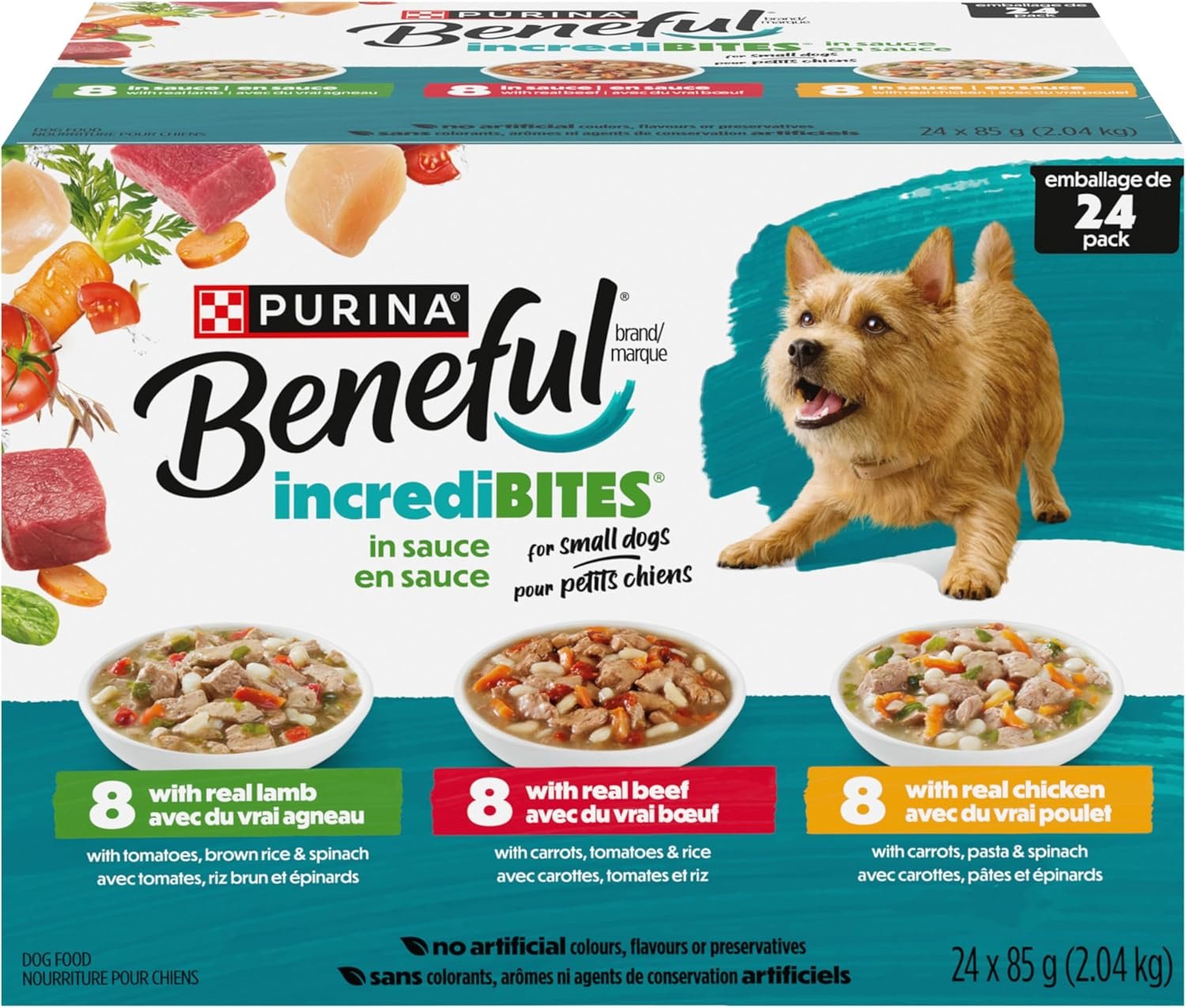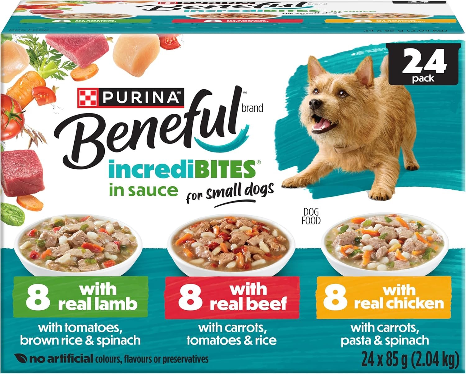 Prepare your small dogs for big flavour adventures with this variety pack. Purina Beneful Small Breed Wet Dog Food Variety Pack, IncrediBites With Real Beef, Chicken and Lamb in sauce, is specially crafted to delight little dogs craving variety. Each tender bite is paired with sauce to satisfy their tiny mouths and big cravings. Made with real beef, chicken and lamb. Beneful IncrediBites for small dogs is made with high protein to support muscles and is 100% complete and balanced including 23 essential vitamins and minerals to support overall health. This wet food for dogs is made with real vegetables. Purina Beneful Small Breed Wet Dog Food Variety Pack, IncrediBites With Real Beef, Chicken and lamb is conveniently packaged in 85g cans—the perfect meal portion for small dogs. This Purina Beneful wet dog food contains no artificial colours, flavours, or preservatives.