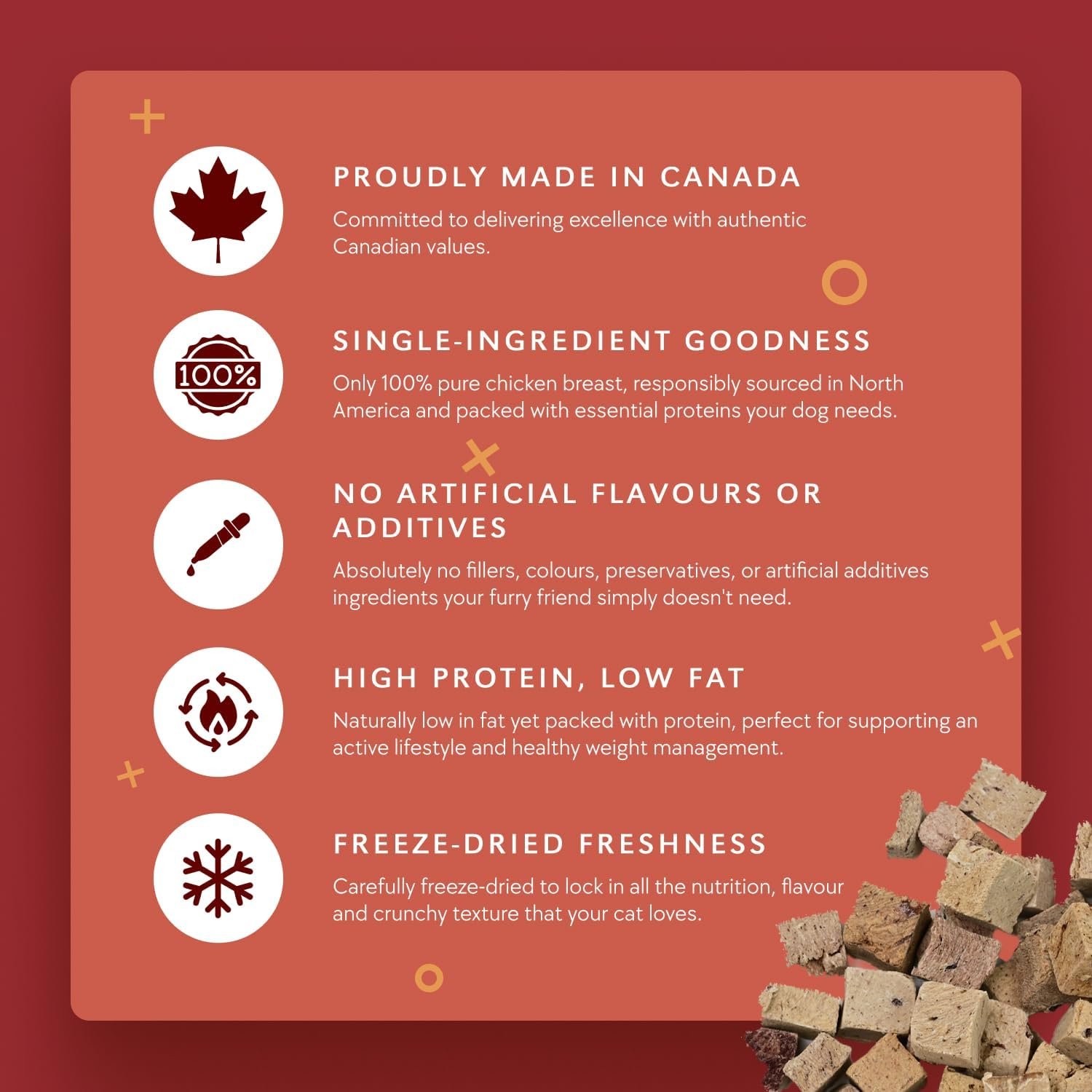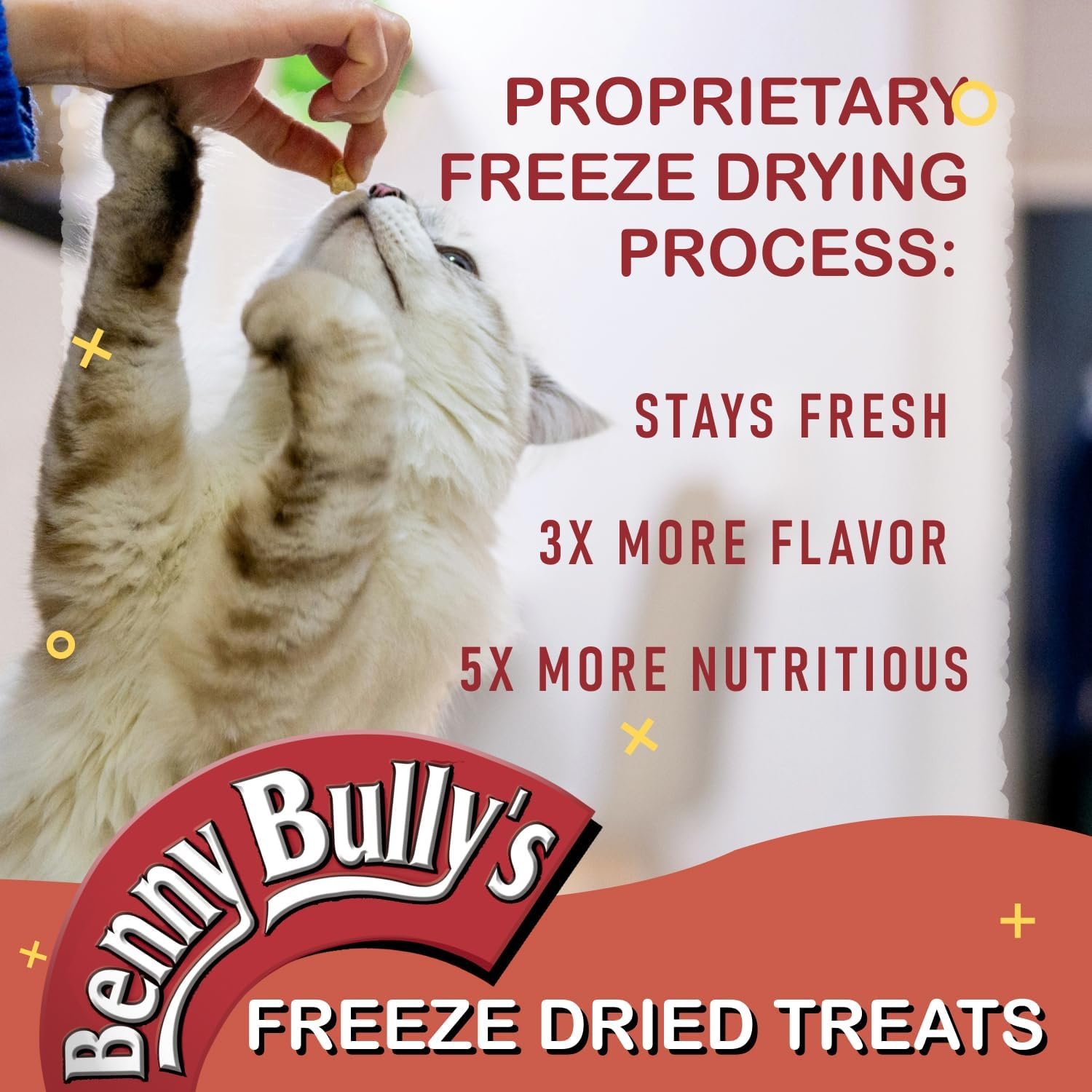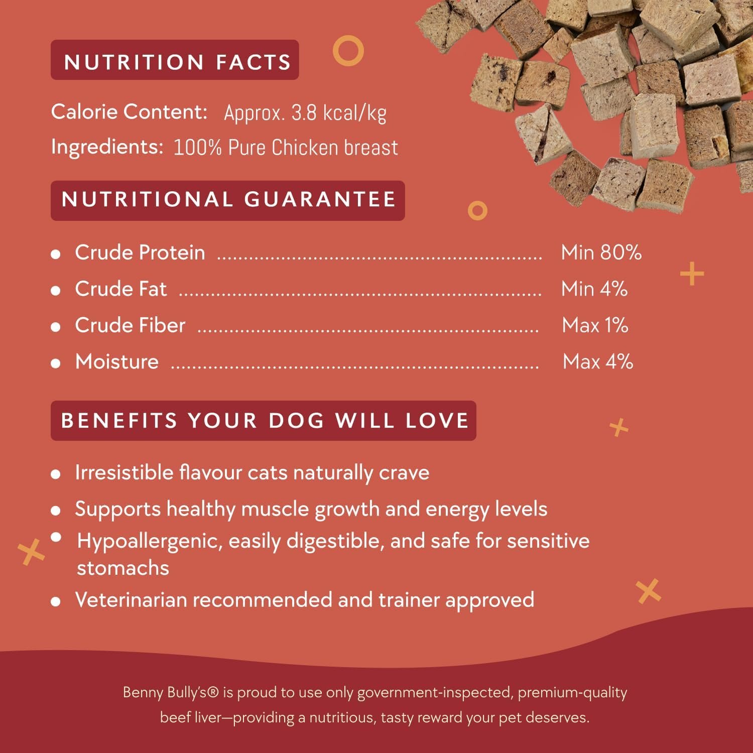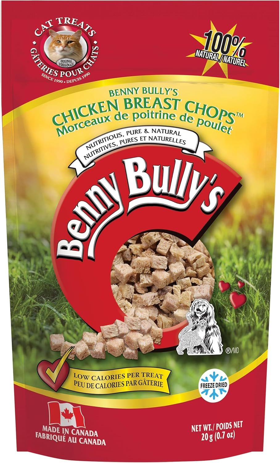 Real Food, Real Nutrition, Real Cat Treats™THE ORIGINAL SINGLE INGREDIENT CAT TREATNO ADDITIVES, FILLERS, COLOURING OR PRESERVATIVESCat owners have discovered Benny Bullys® as a nutritious pure and natural alternative to traditional cat treats. We developed an innovative cutting and drying process, as an alternative to conventional food preservatives, making Benny Bullys® one of the few “no chemicals added” treats on the market today. Made from pure chicken breast, we specially sized each piece small enough to provide easy feeding and maximum palatability to the most hard to please cats. Benny Bullys® is hand selected from government inspected meat sections for the health conscious cat owner.