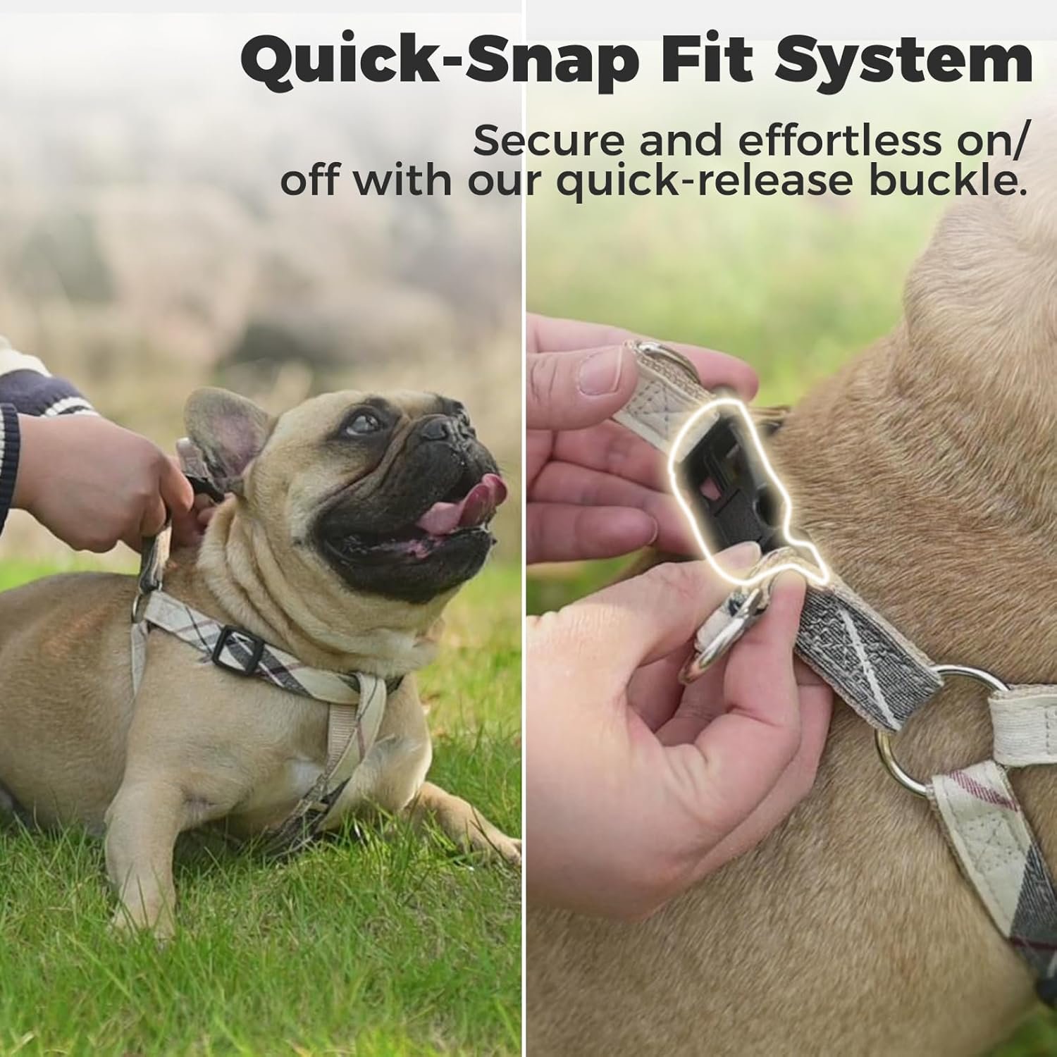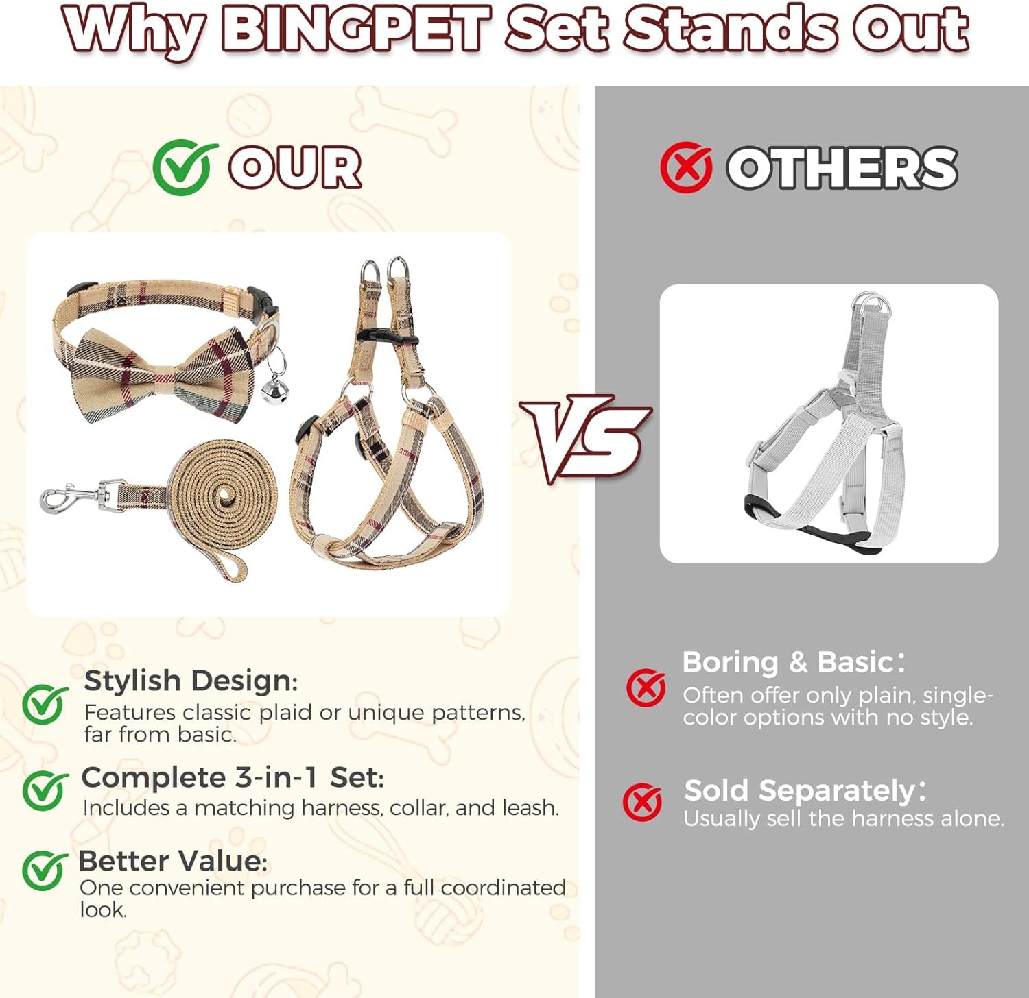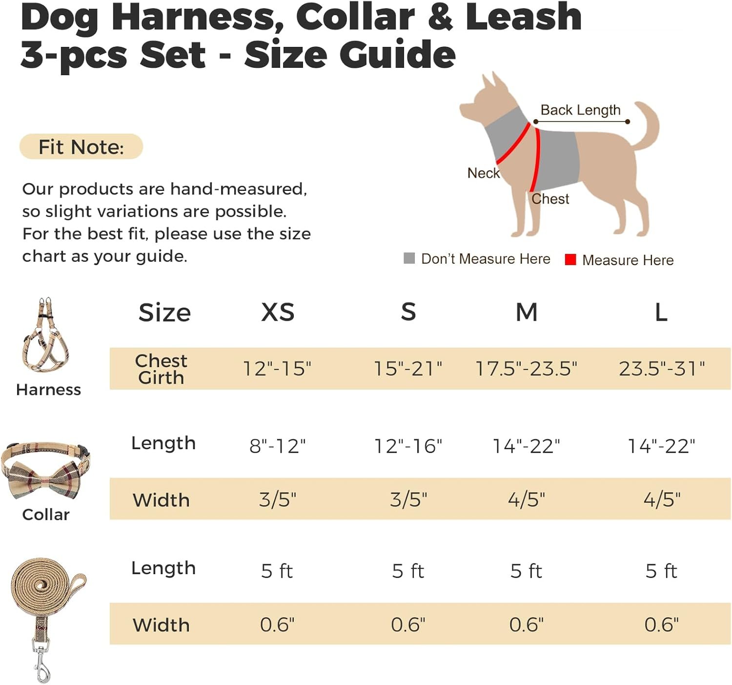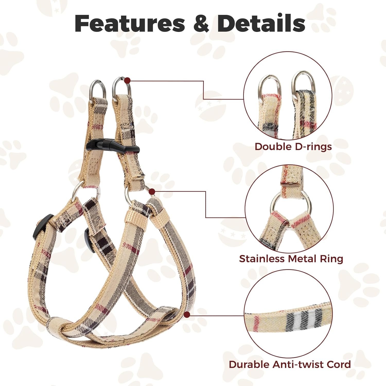 BINGPET Dog Harness Collar Leash Set,Adjustable No Pull Escape Proof Small Dog Harness,Classic Plaid Puppy Harness and Leash Set for Small Medium Large Dogs Training Easy Walk Running(Beige,S)