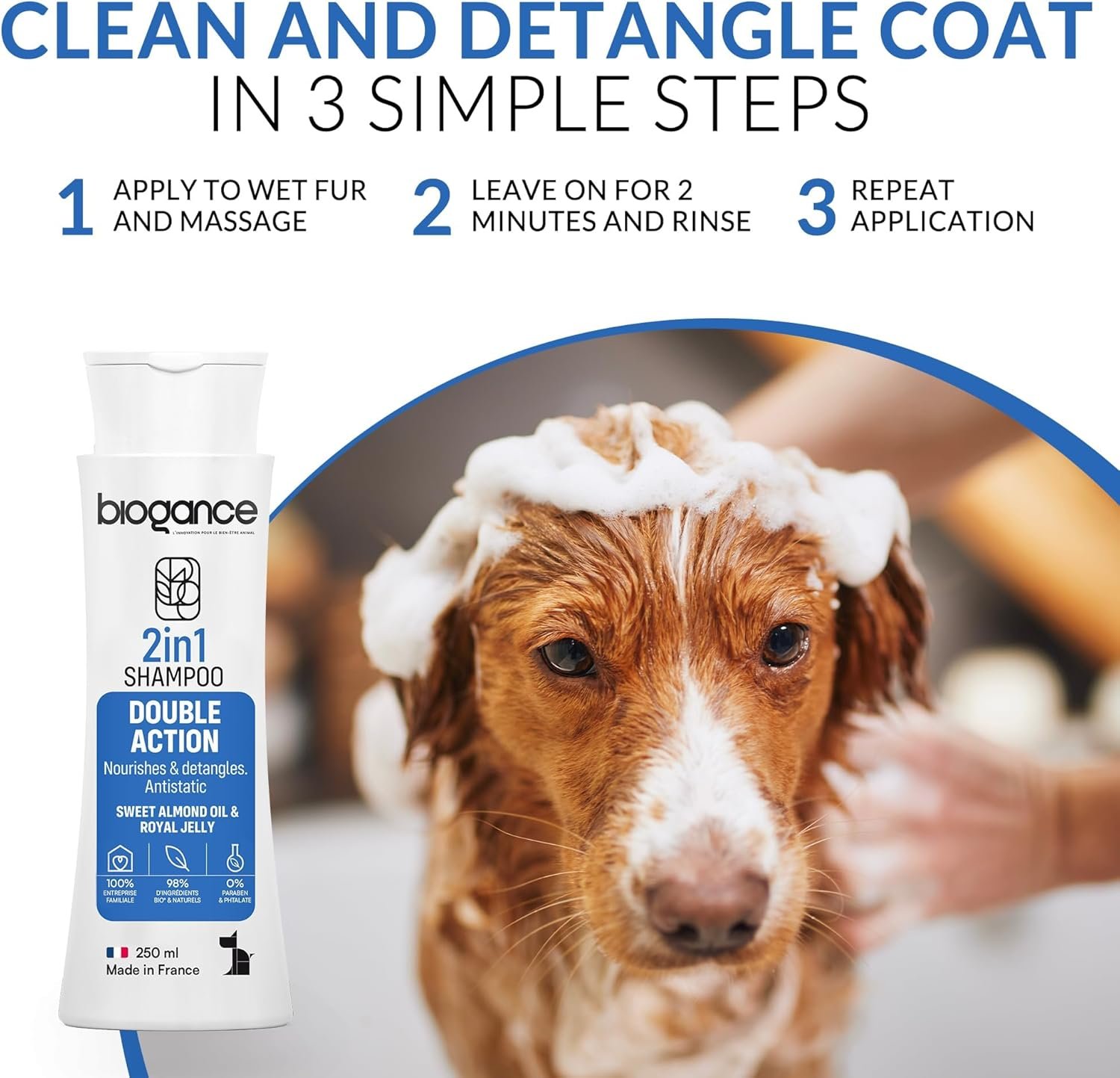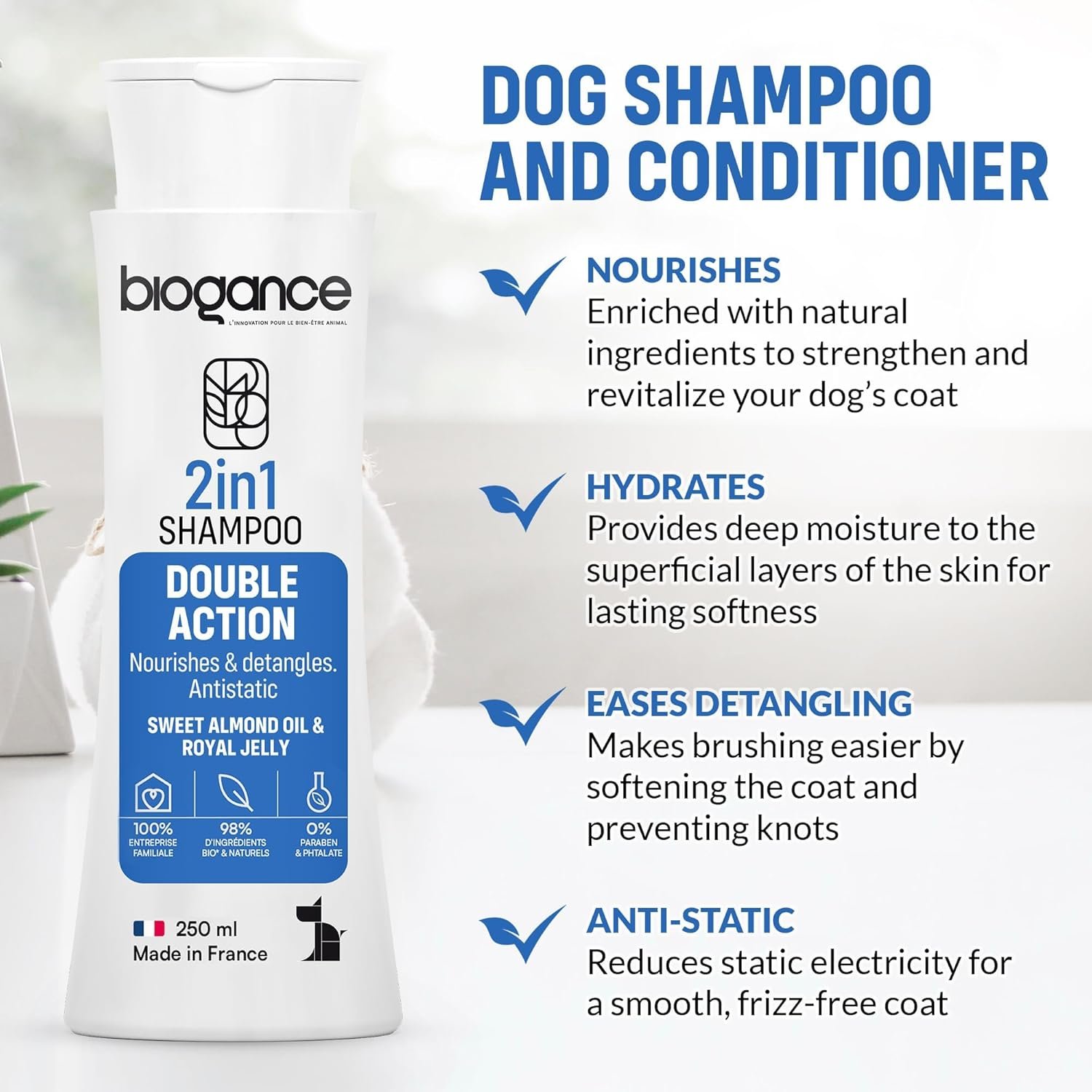 Biogance 2-in-1 Dog Shampoo and Conditioner, Enriched with Sweet Almond Oil and Royal Jelly (250ml), Nourishing and Hydrating for All Coat Types, Organic Ingredients, Made in France