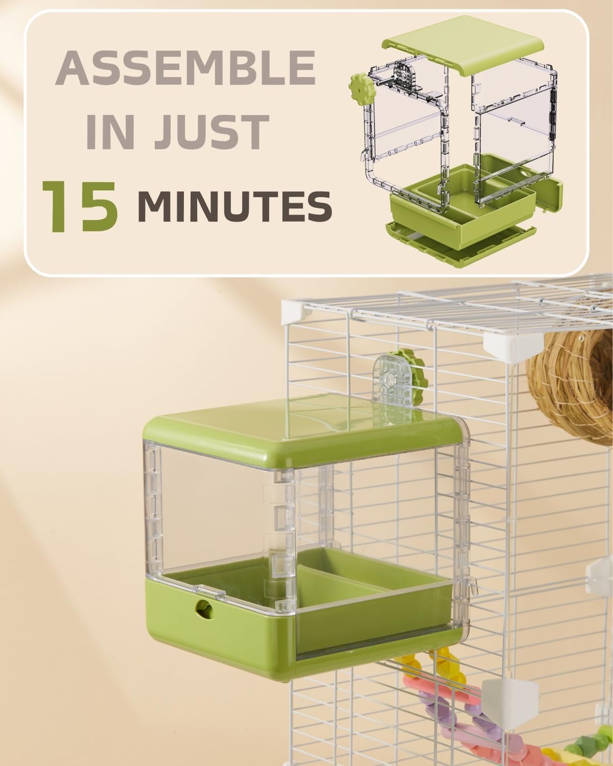 Designed for straightforward installation, the bath can be ready for use in just 15 minutes following the clear instructions. Its adaptable mounting system ensures secure fitting on most standard bird cages.