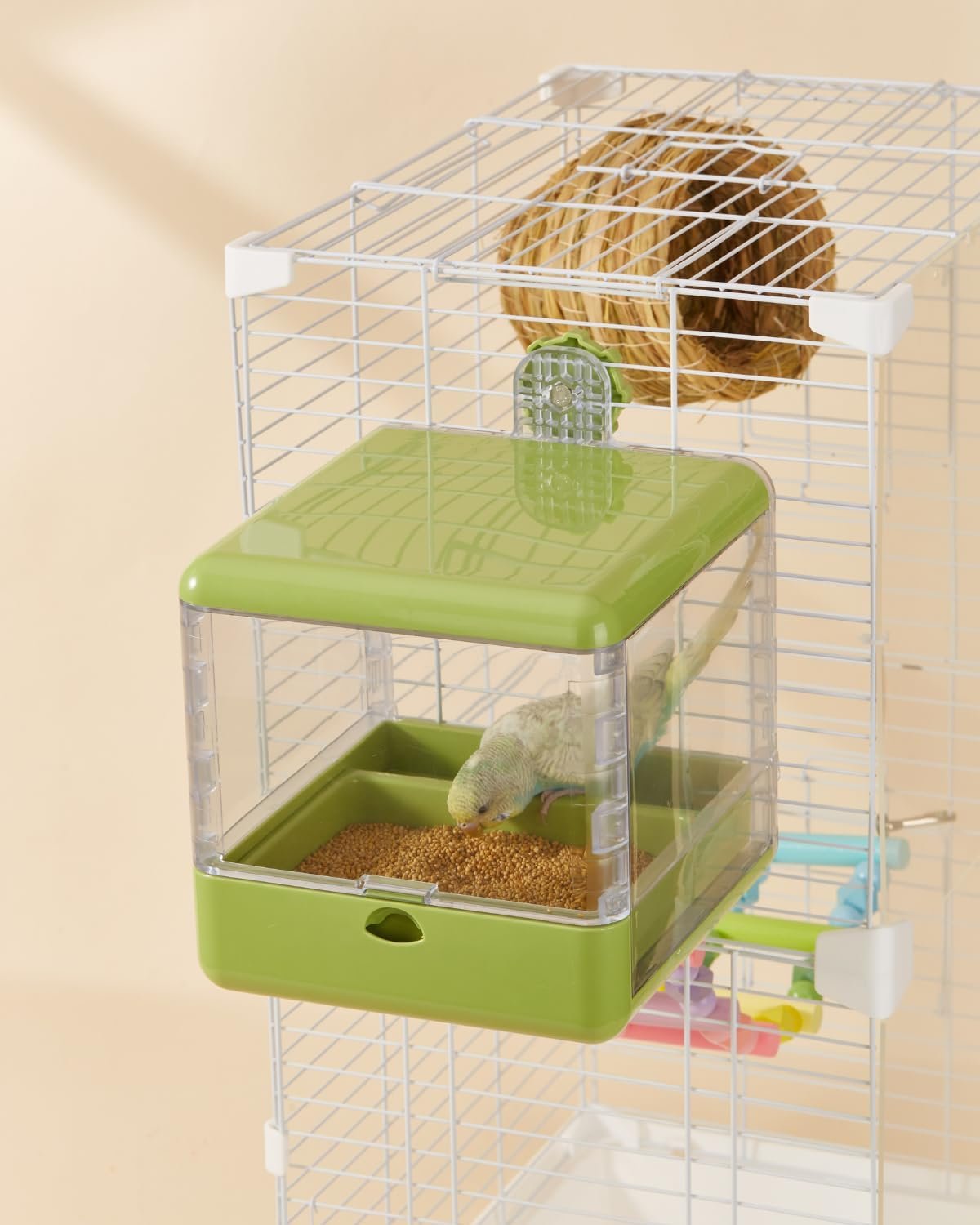 With dimensions of 17×17×18cm, this generously sized unit provides ample room for both bathing and feeding. The clever combination of these functions in a single unit makes it an ideal space-saving solution for your bird’s daily needs.