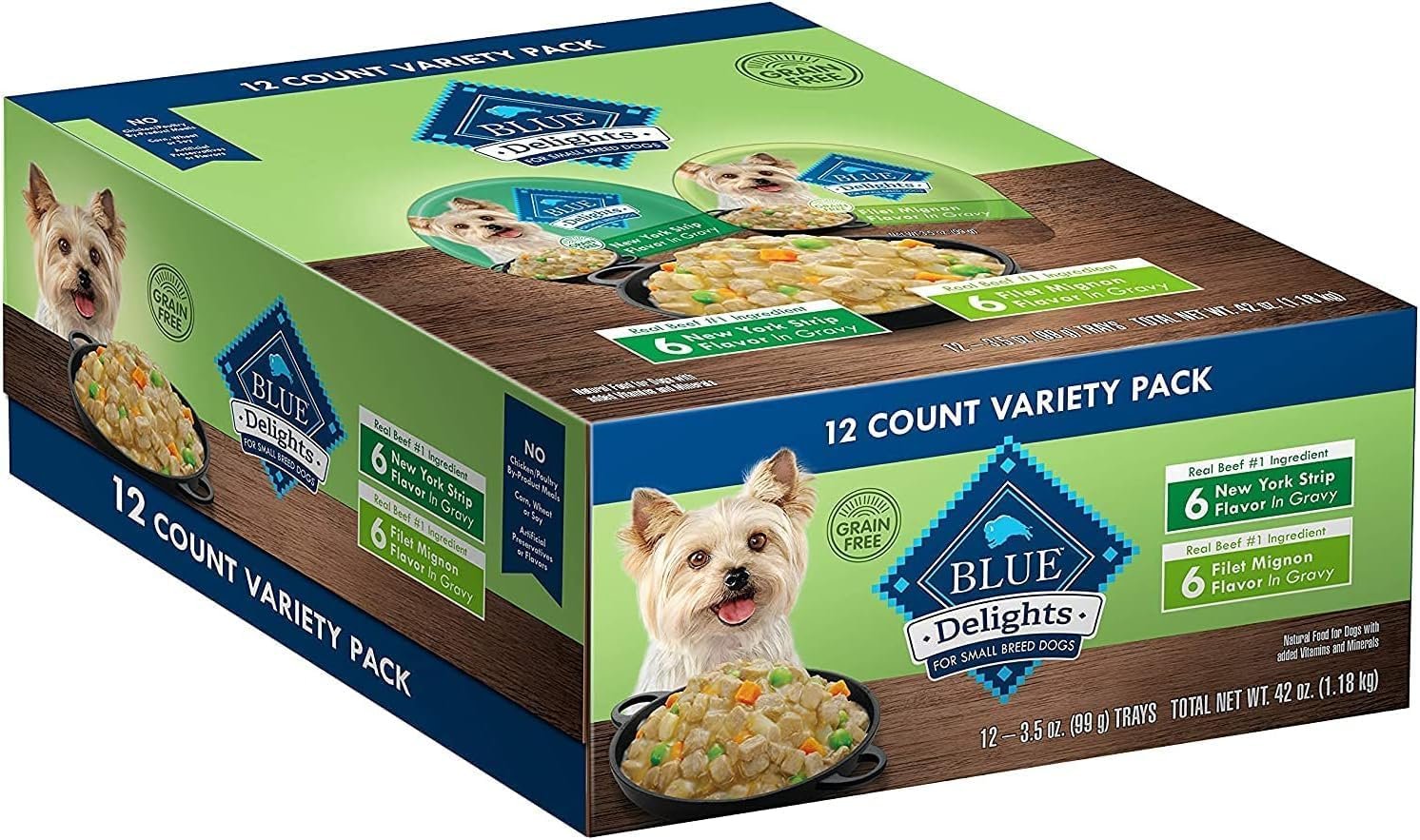 Ideal for smaller dogs, BLUE Delights wet dog food tray variety packs feature gourmet entrées sure to please.