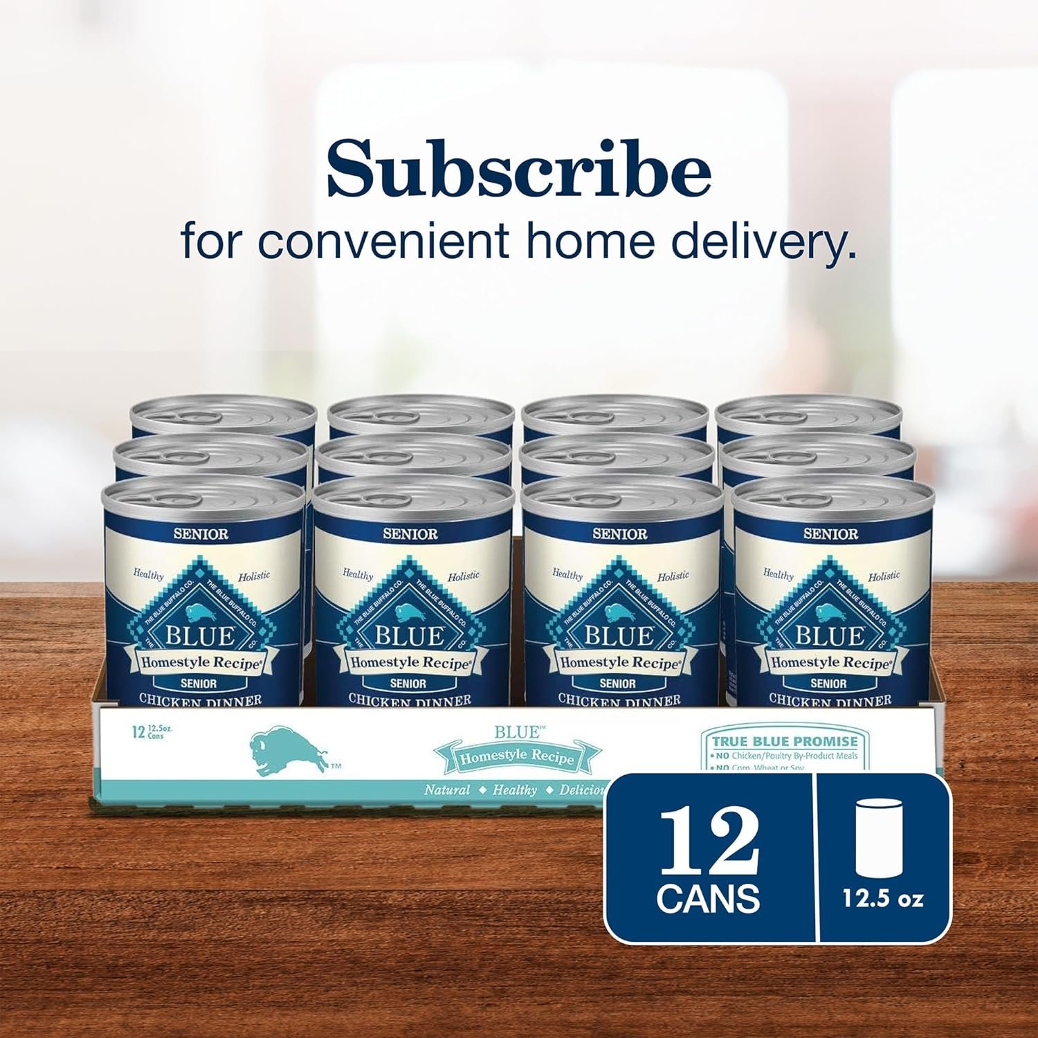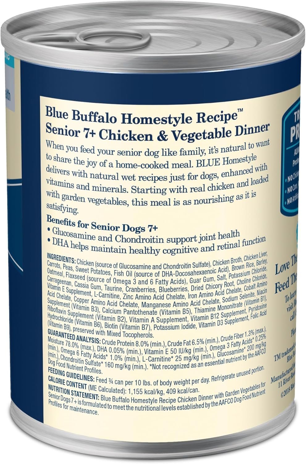 Contains twelve (12) 354g cans of BLUE Homestyle Recipe Natural Senior Wet Dog Food, Chicken