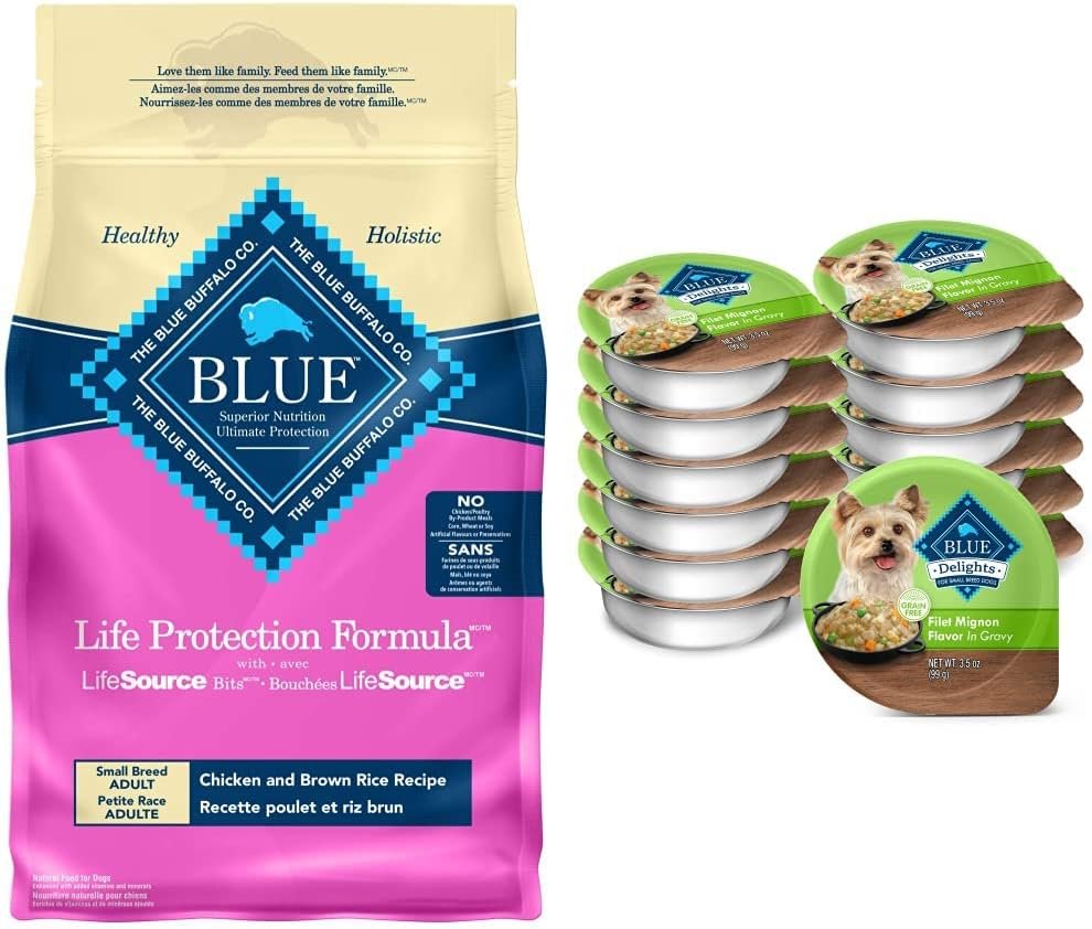 Blue Buffalo Life Protection Formula Small Breed Dog Food Natural Dry Dog Food & Blue Buffalo Delights Natural Adult Small Breed Wet Dog Food Cups, Filet Mignon Flavor