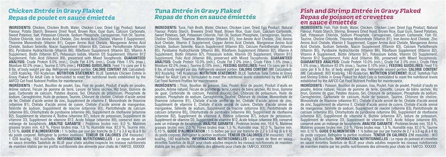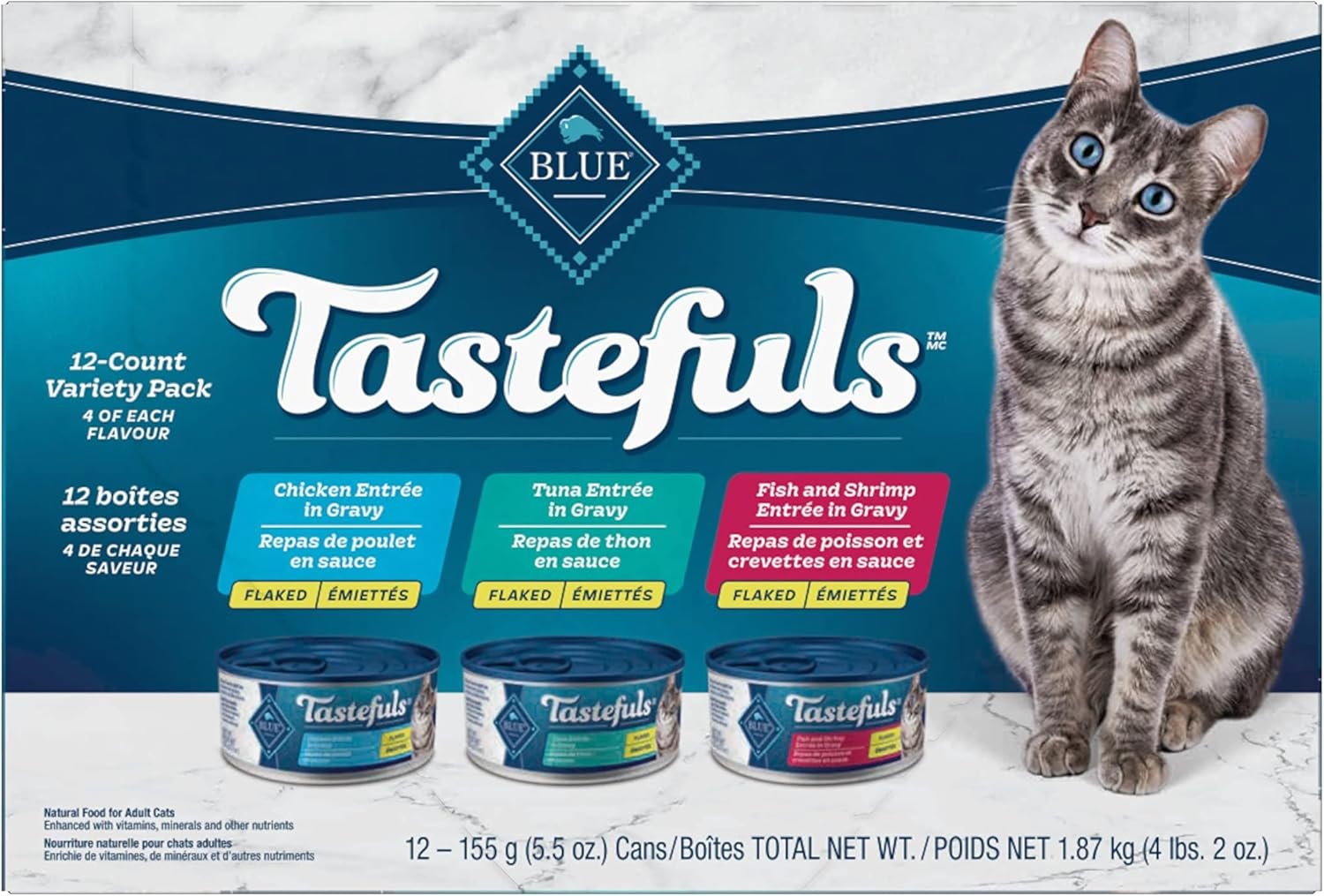 Contains one (1) Variety Pack of BLUE Tastefuls Natural Flaked Wet Cat Food, Tuna, Chicken, Fish & Shrimp Entrées in Gravy 5.5-oz cans (12 count – 4 of each flavor)