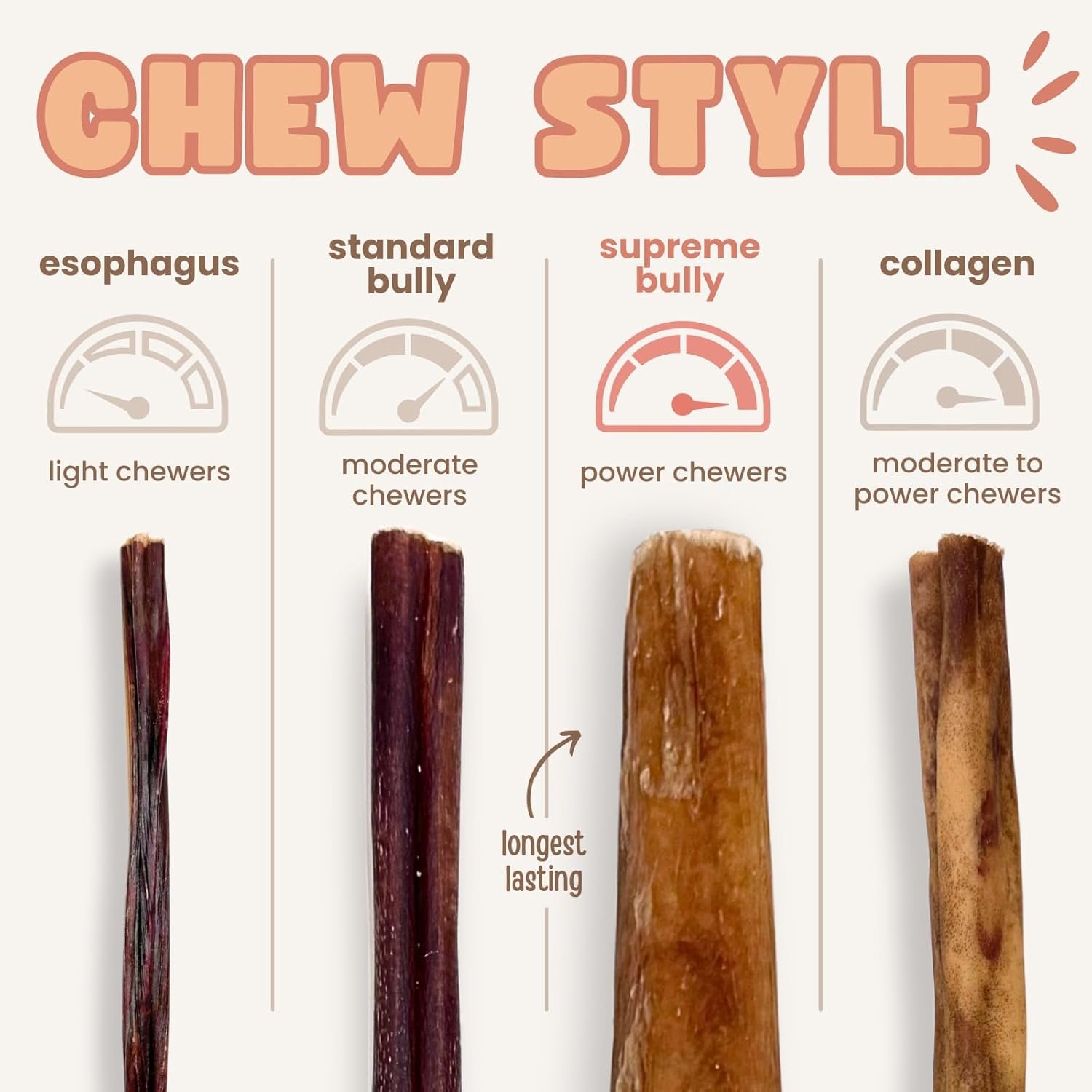Designed for Larger Dogs & Power Chewers: Our Bully Sticks Supreme are naturally harder and more durable than standard sticks, offering extended chewing time and greater satisfaction for bigger dogs and aggressive chewers.