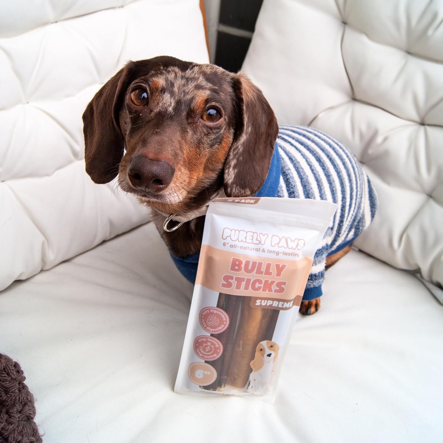 Extra Thick Bully Sticks for Aggressive Chewers: Purely Paws Bully Sticks Supreme are specially selected for their thicker cut, making them ideal for large breeds and strong chewers who need a more challenging, long-lasting chew.