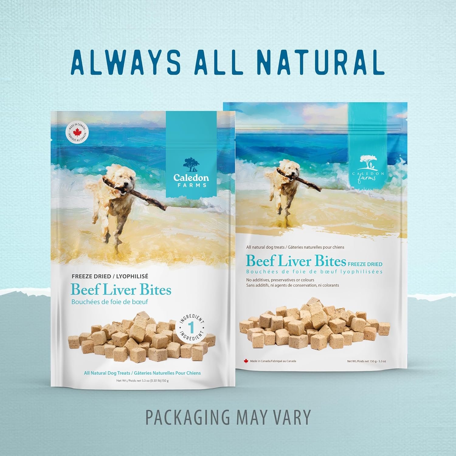 Treat your dog with Caledon Farms freeze-dried Beef Liver Bites – a single ingredient delight adored by dogs and pet parents. Made solely from North American sourced beef liver and free from any artificial additives, ingredients, and colours, these delicious meaty treats are all natural and each bite is filled with the best nutrition.   Our Beef Liver Bites are freeze-dried to lock in the freshness and nutrients of raw beef liver, giving you a high-protein, nutrient-dense treat full of rich flavour your dog with love! Loaded with essential vitamins and minerals, including iron to support a healthy circulatory system and zinc to boost immune system function, Caledon Farms Beef Liver Bites are crafted to support your dog’s overall health. Plus, they are packed with high-quality protein which promotes muscle development and strength. With a light, airy texture and bite-sized pieces, these treats are ideal for training, enrichment activities, and dogs of all ages and sizes.   Led by a family of pet parents since 2006, each chew is crafted with love by passionate people who pour their heart and soul into every batch. Proudly made in our own Canadian facility, we ensure the best quality and pure bliss in every single bite. Caledon Farms Beef Liver Bites nourish the all-natural bond between you and your dog for the ultimate in tail-wagging happiness!   Caledon Farms – Real Bonds Grow Here