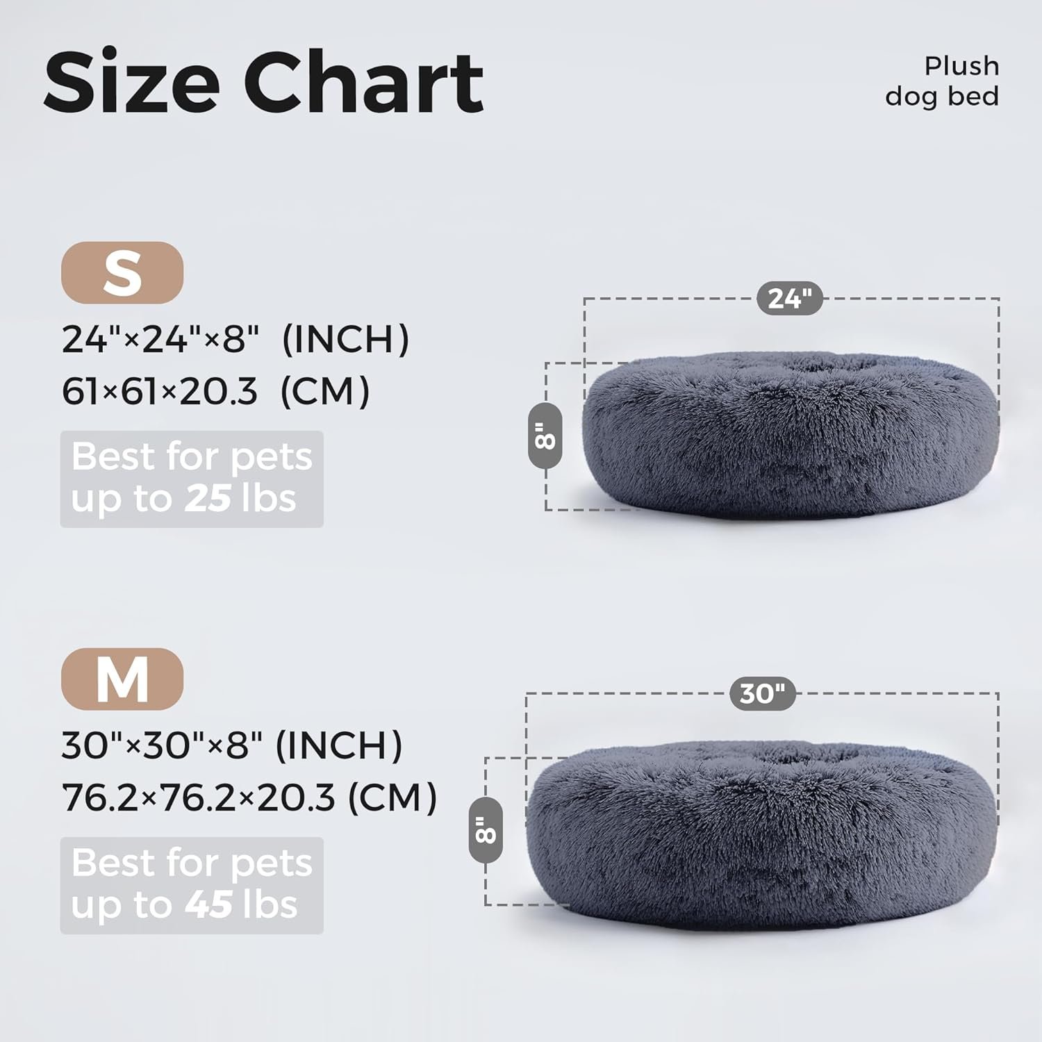 【SUITABLE SIZE】Three sizes are available for your choice. We recommend a 20-inch dog bed for small dogs (up to 11 pounds), a 24-inch dog round bed (up to 25 pounds), and a 27-inch dog calming bed (up to 35 pounds), it is recommended that you measure the size of your pet before buying