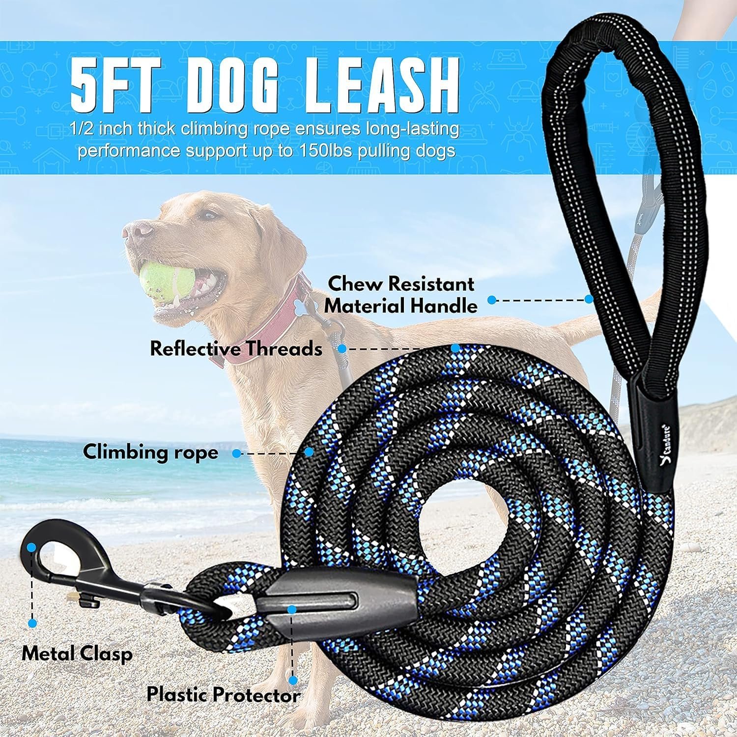 Strong and Durable: This 5ft long leash for dogs is made of premium climbing nylon rope with 1/2-inch diameter, designed for small and medium dog breeds. Recommended for dogs 10–55kg