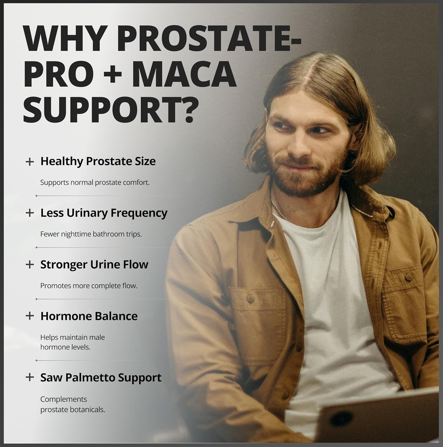 Complete Urological Care: Specially formulated for men, Prostate-Pro + Maca Support provides targeted urological support to ease issues like incomplete voiding and urinary difficulties, contributing to a healthier prostate. This essential supplement helps improve daily comfort and promotes uninterrupted nights, freeing you from frequent trips to the bathroom so you can focus on what truly matters.