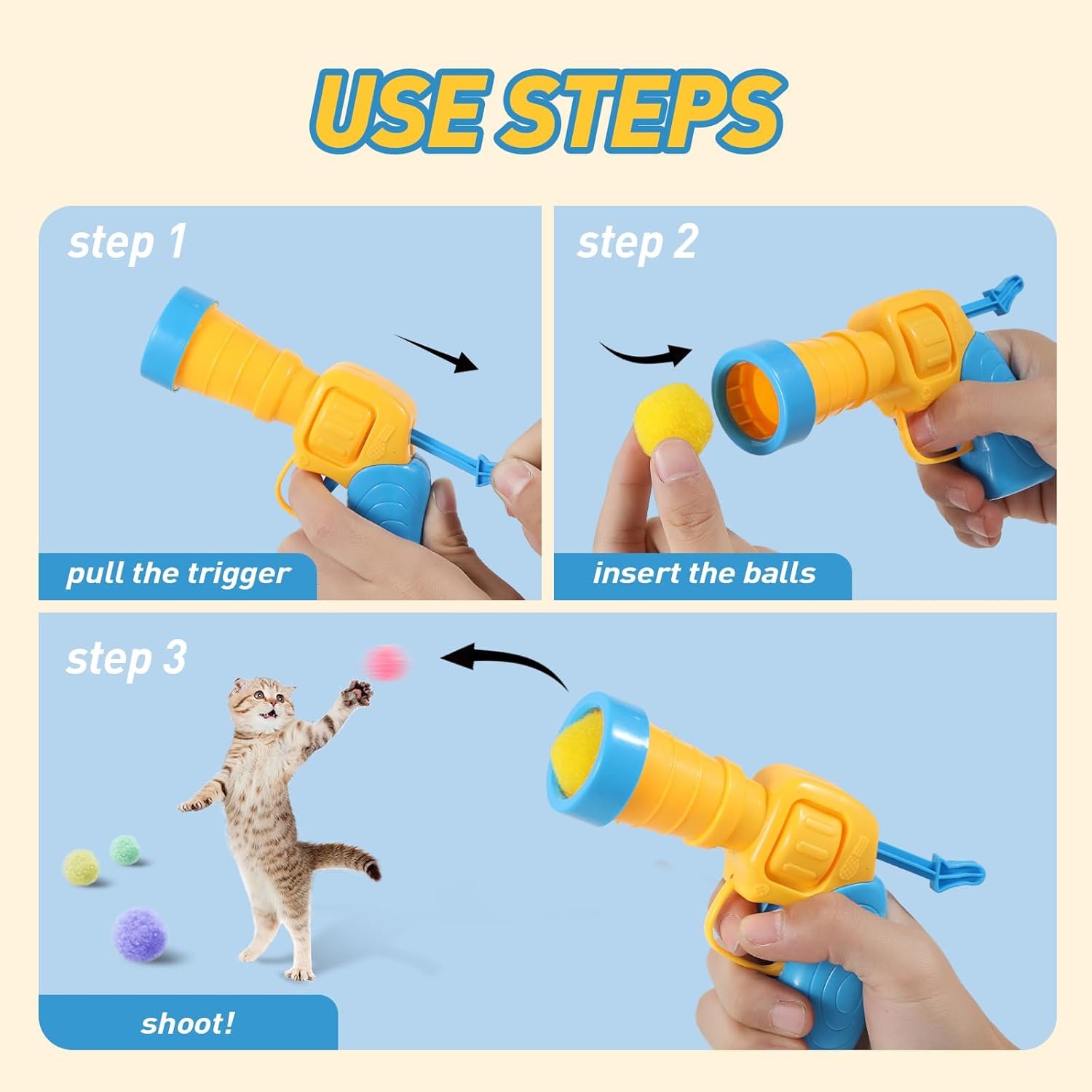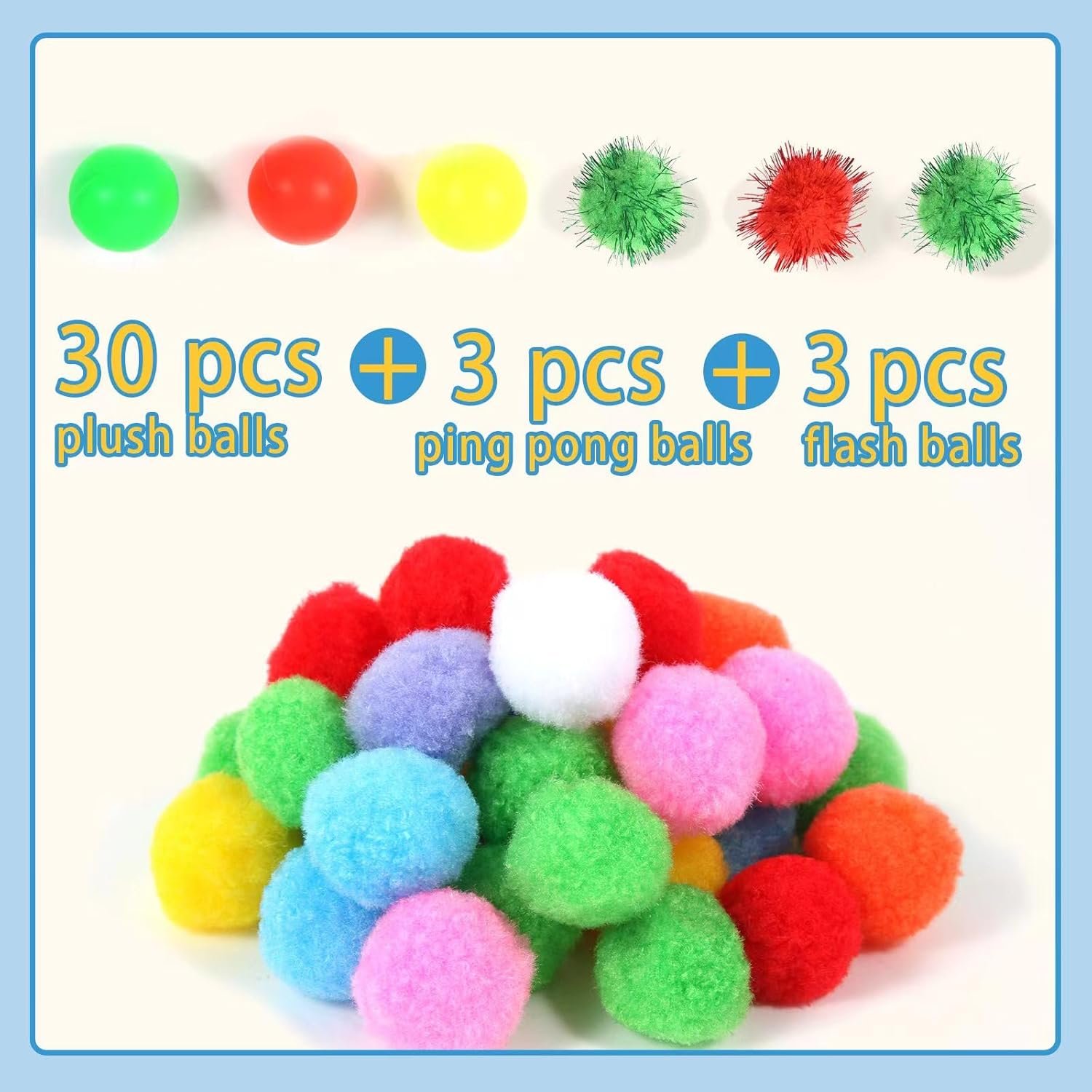 More Thoughtful Combination for Kitten Toys: This cat toy for indoor cats comes with a cat ball launcher, 3pcs flash ball, 3pcs small ping pong balls and 30pcs tiny plush pom pom balls. The balls are all 1 inch in diameter. A perfect cat balls fetch toy that can involve both kittens and you.