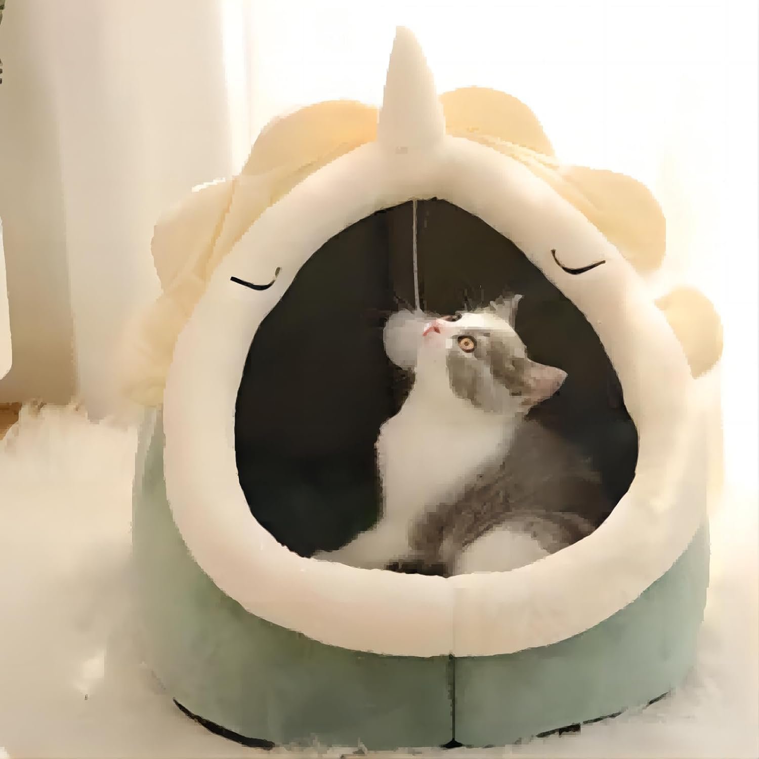 The cat beds is a semi-enclosed design, the cat nest top hanging plush ball, so that your pet can get comfortable sleeping environment, but also can play.