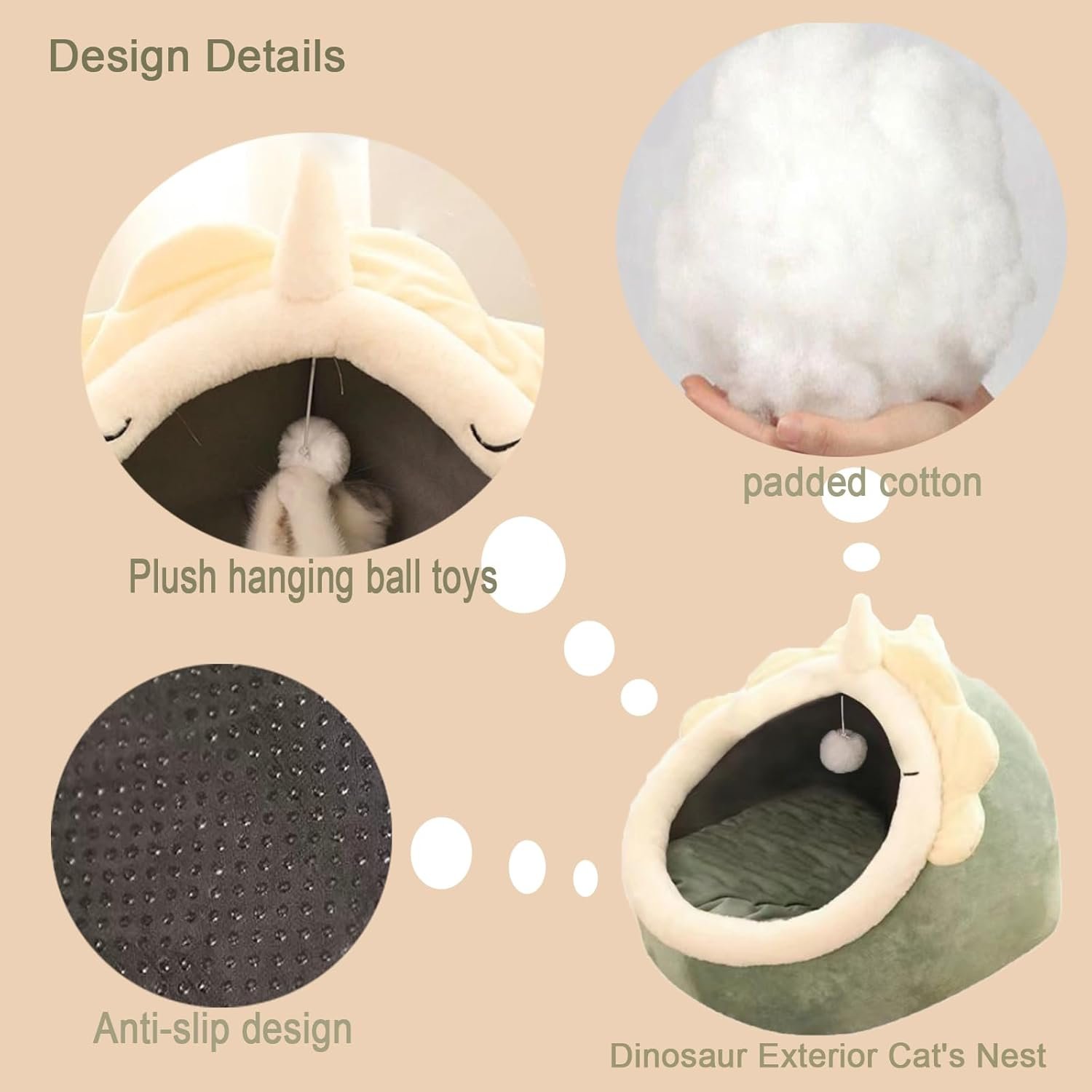 The kitten bed shape is similar to the design of small dinosaurs, the combination of yellow and green, which is playful and cute.