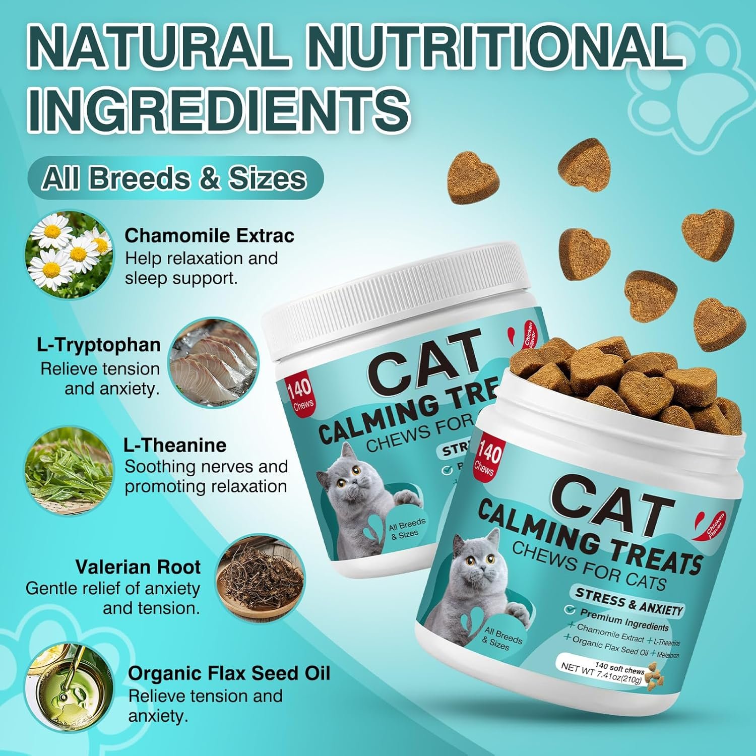 Cat Calming Treats, 140 Soft Chews to Relieve Anxiety, Stress & Prevent Bites, Perfect for Travel & Veterinary Visits, Soothing Calming Care for Indoor Cats Chicken Flavor 7.41 OZ