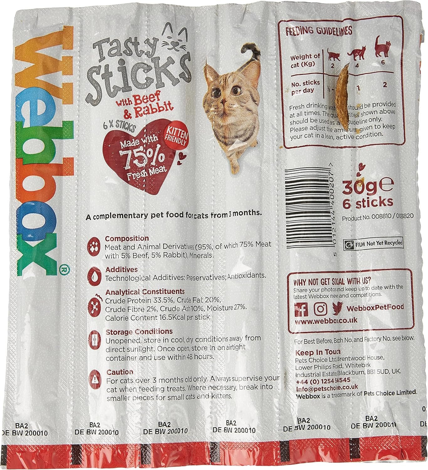 Webbox Cats Delight Cat Sticks are a complementary pet food for cats/kittens. Perfect to feed at any time as a tasty, chewable snack or treat. Gently cooked to produce a delicious, moist, meaty treat, your cat/kitten will adore Webbox Cats Delight cat sticks! Each treat stick is individually wrapped for freshness – to open, simply tear open from the top of the pack.