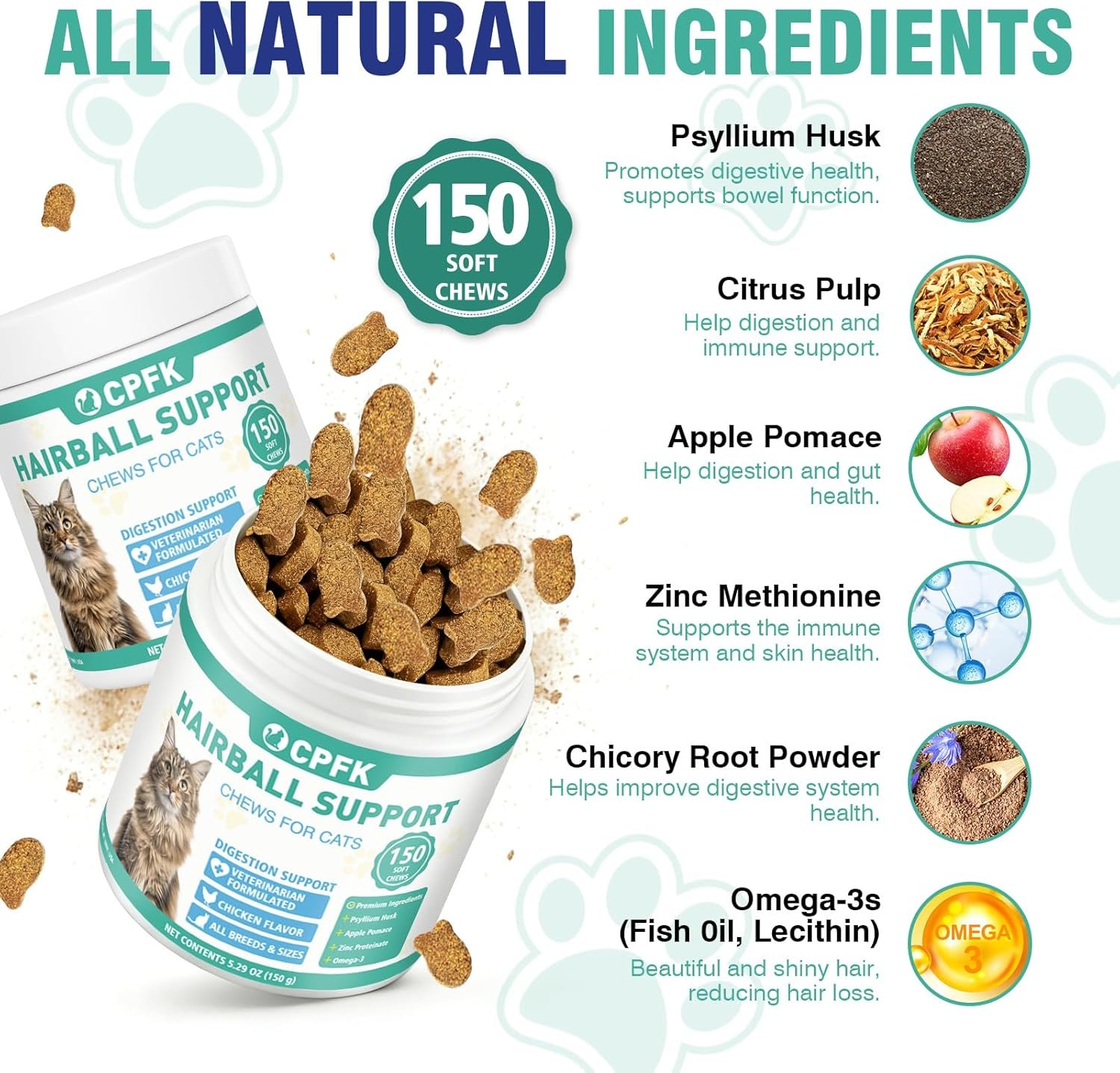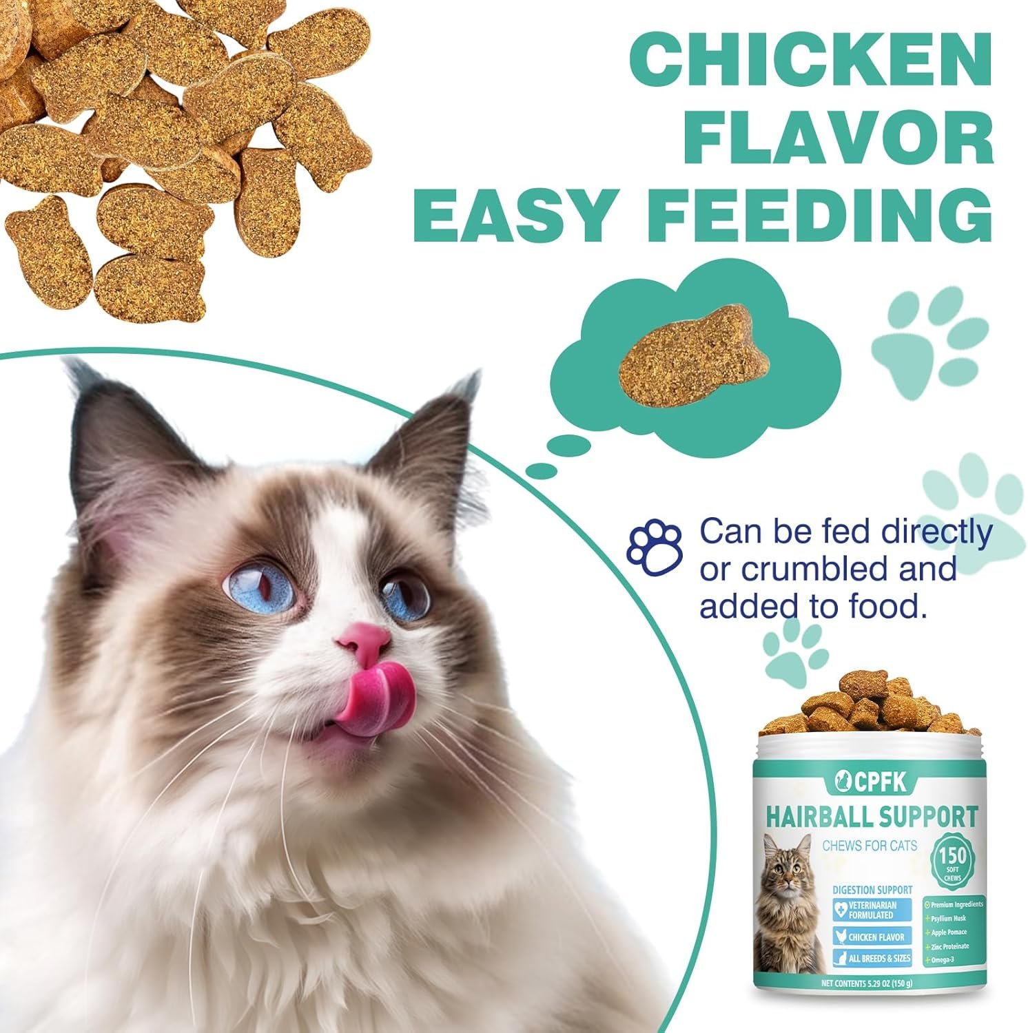 Cat Hairball Remedy Treats, 150 Soft Chews Cat Hair Ball Treatment Furball Control Relief Helps Eliminate and Prevent Hairballs for Indoor Cats Supports Skin and Coat Digestion Chicken Flavor