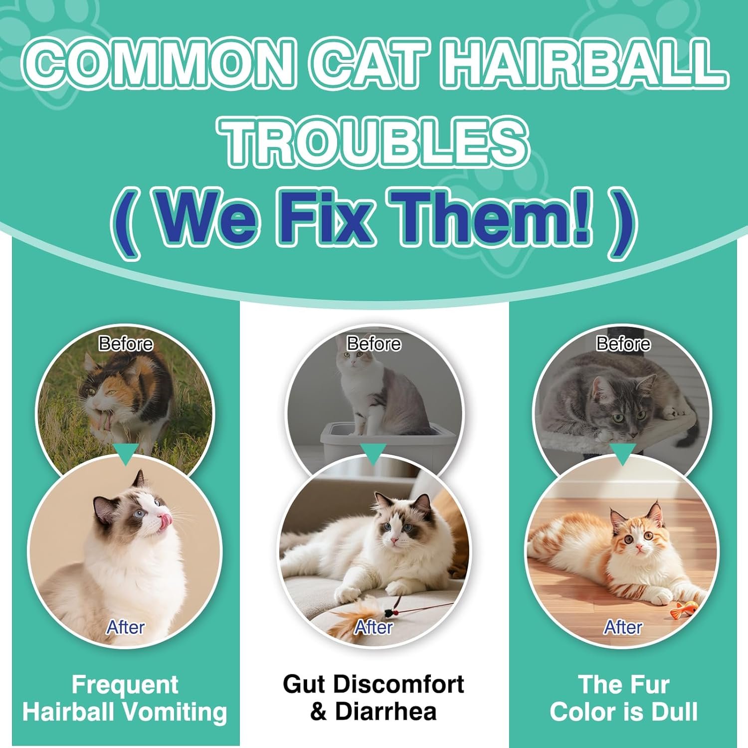 Multiple Functions: Hairball treatment for cats has multiple functions. Hairball treats for cats not only helps reduce the formation of hair balls and promotes the removal of hair balls. Cat hairball treats can also support skin and digestive health. Hairball cat treats is also beneficial to cat hair health and reduces cat hair loss. This small piece of cat hair ball treats is a safe helper for cats