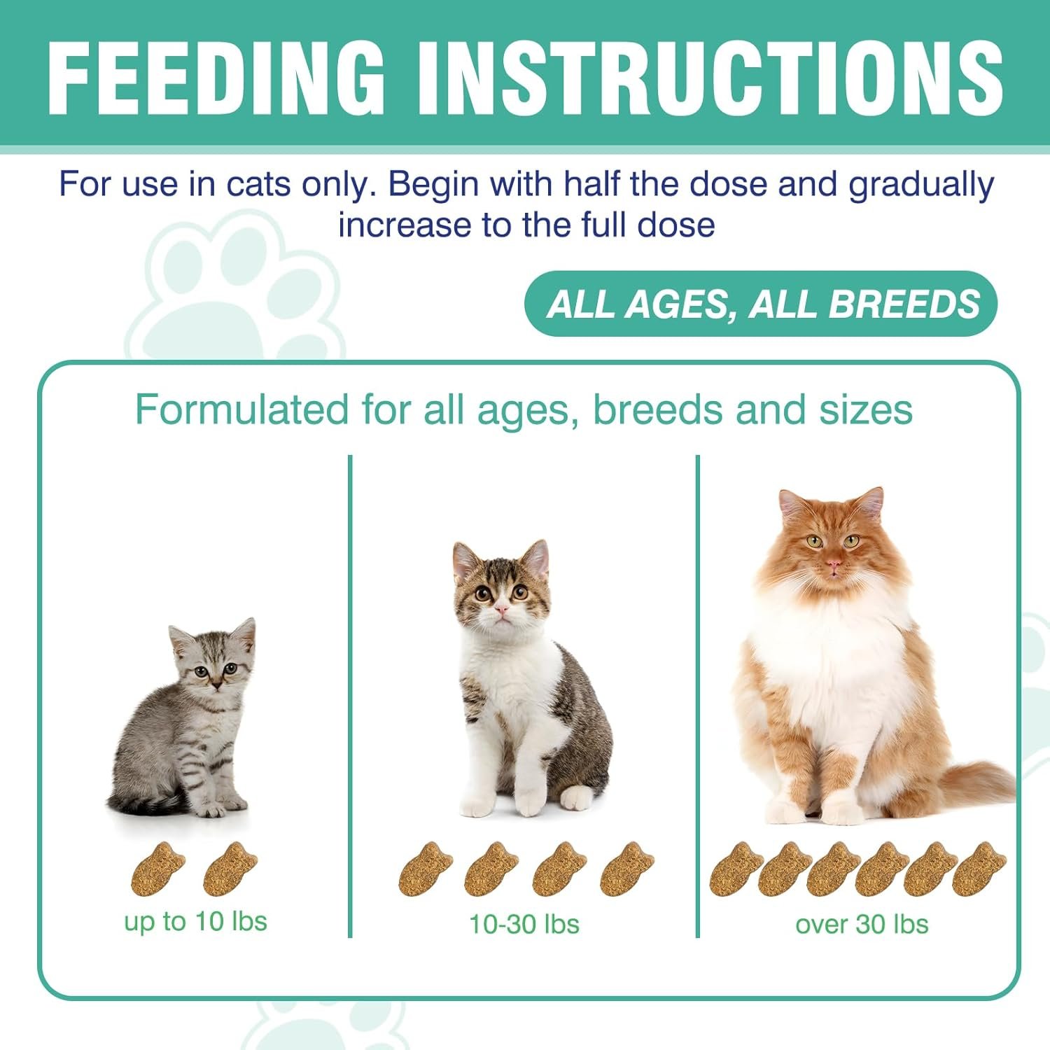 Scientifically Formulated, Safe and Effective: Cat furball treatment is made with safe and reliable ingredients such as apple pomace, zinc proteinate and psyllium husk. Each tablet of cat hairball treats is precisely measured to ensure the safety and health of your cat. Simply feed cat hairball control scientifically according to your cat’s weight. Cat hairball relief does not require the use of any laxatives or mineral oils. Hairball treats does not contain corn, wheat or artificial colors