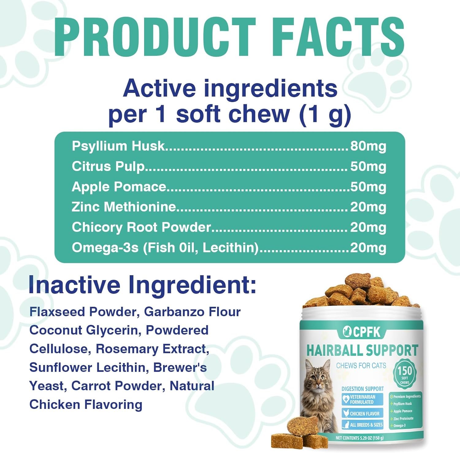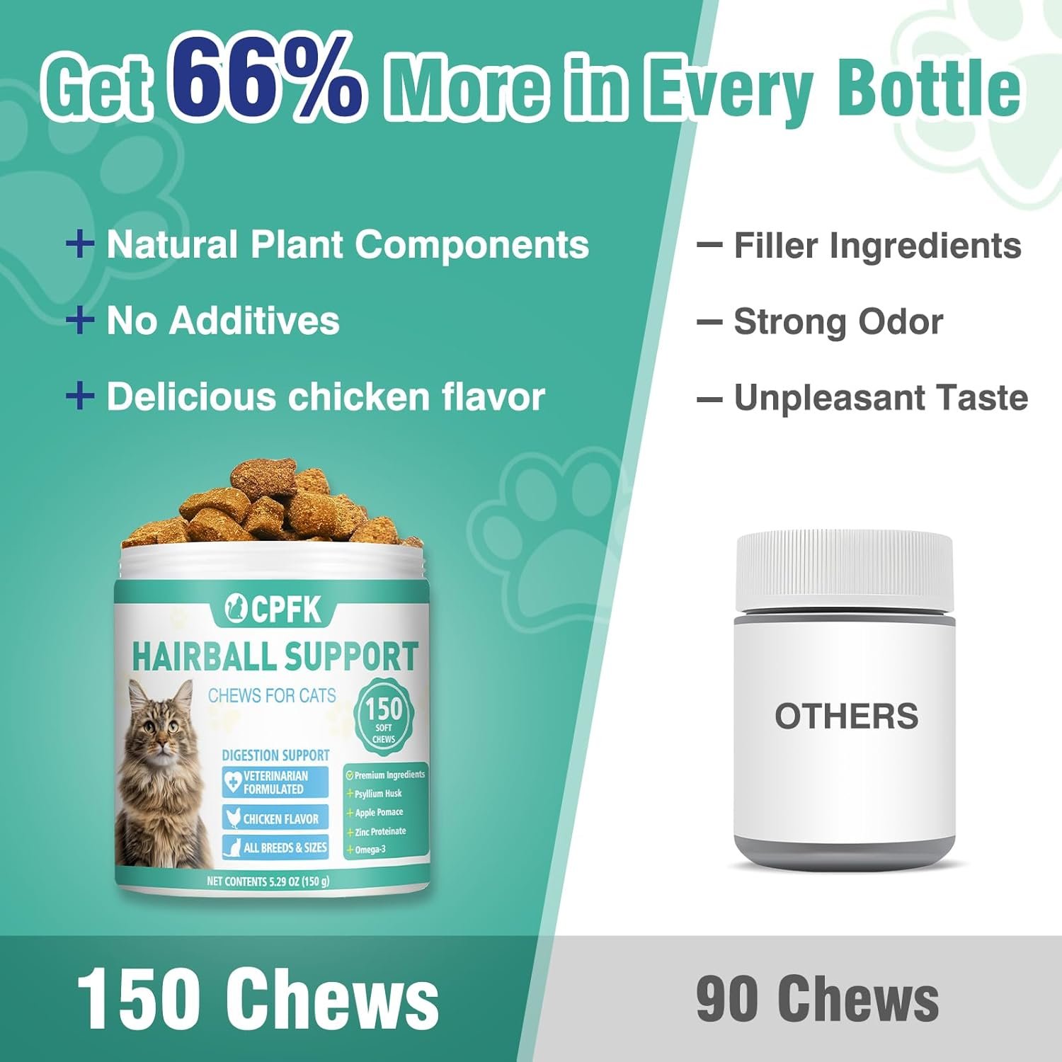Help Reducing and Managing Hairballs: This 150 chews cat hairball treats helps promote the removal of hairballs in cats. Our hairball treats for cats is formulated with plant extracts. Hairball treats is a tasty chew. Our hairball cat treats is easier to feed cats than other forms of cat hairball remedy, so even picky cats will enjoy it. Consistent use of cat hairball treatment can help prevent hairballs in cats
