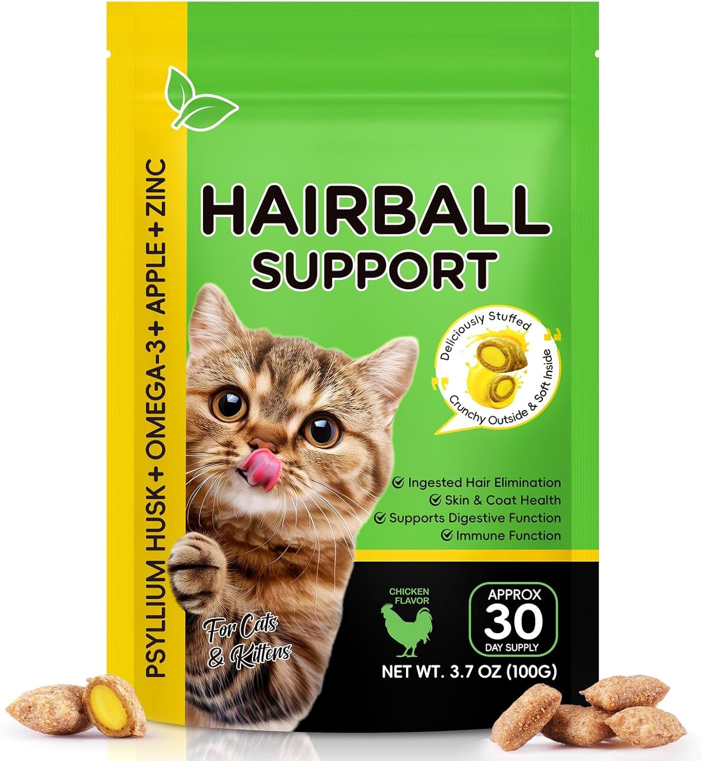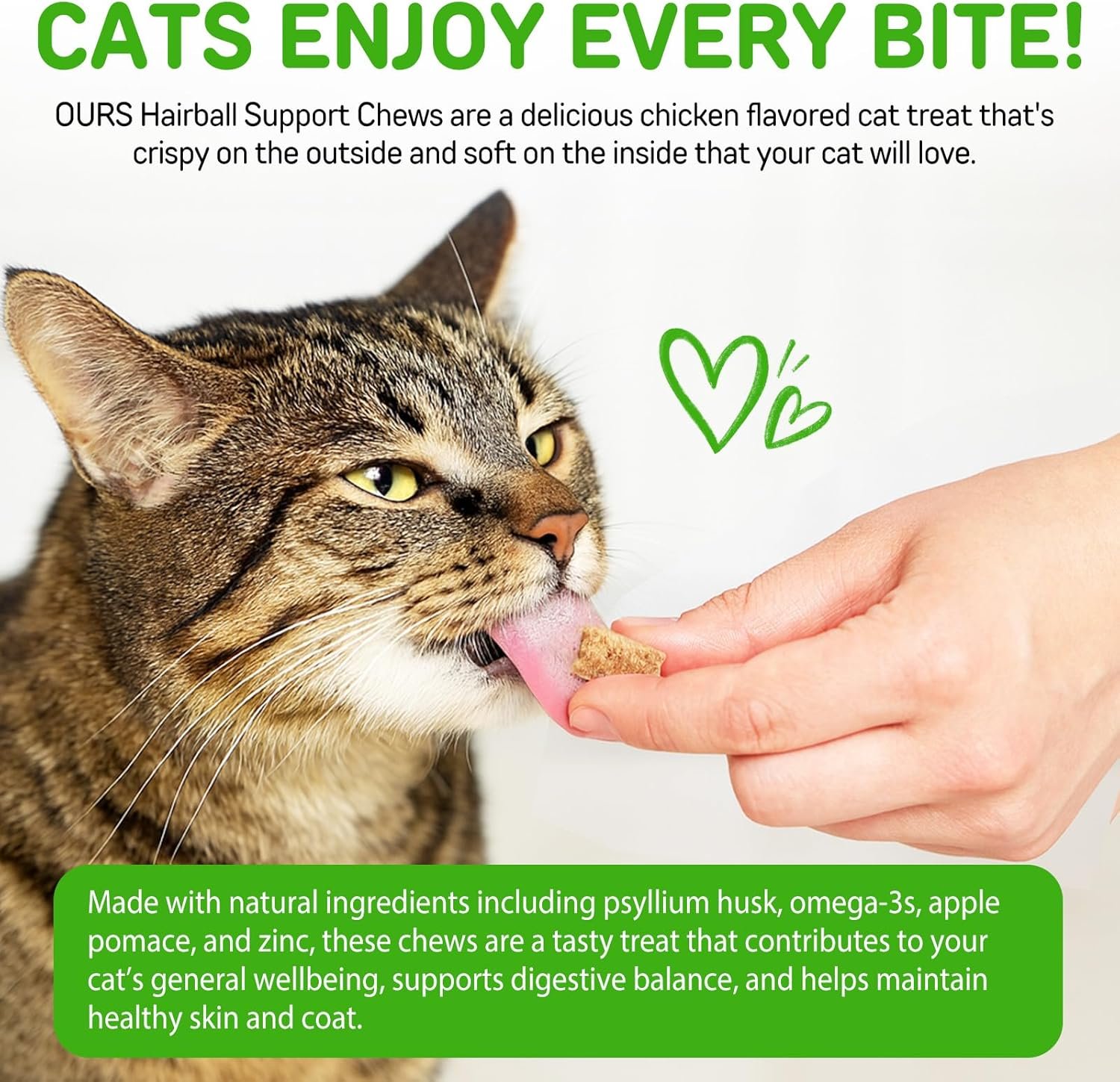 Cat Hairball Support Chews, Crunchy & Soft Treats for Healthy Digestion Wellness, Skin Health & Shiny Coat Care, Chicken Flavor, 30-Day Supply