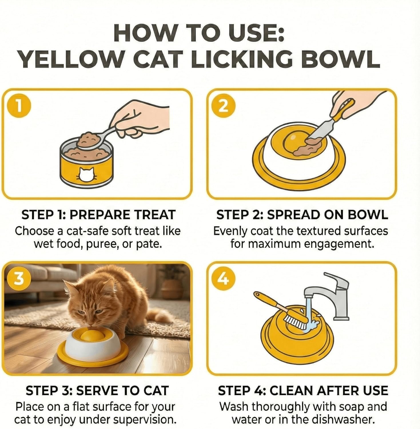 Cat Lick Mat & Slow Feeder Bowl for Cats Small Dogs, Interactive Enrichment Toy for Anxiety Relief & Boredom, Calming Treat Dispenser (Yellow)