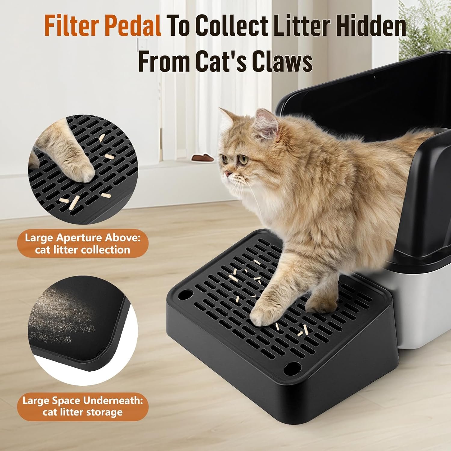 Easy to Clean: The cat litter box stair features a large aperture pedal and hidden opening lid. This design collects dropped litter and allows for quick opening the litter box step for easy cleaning.