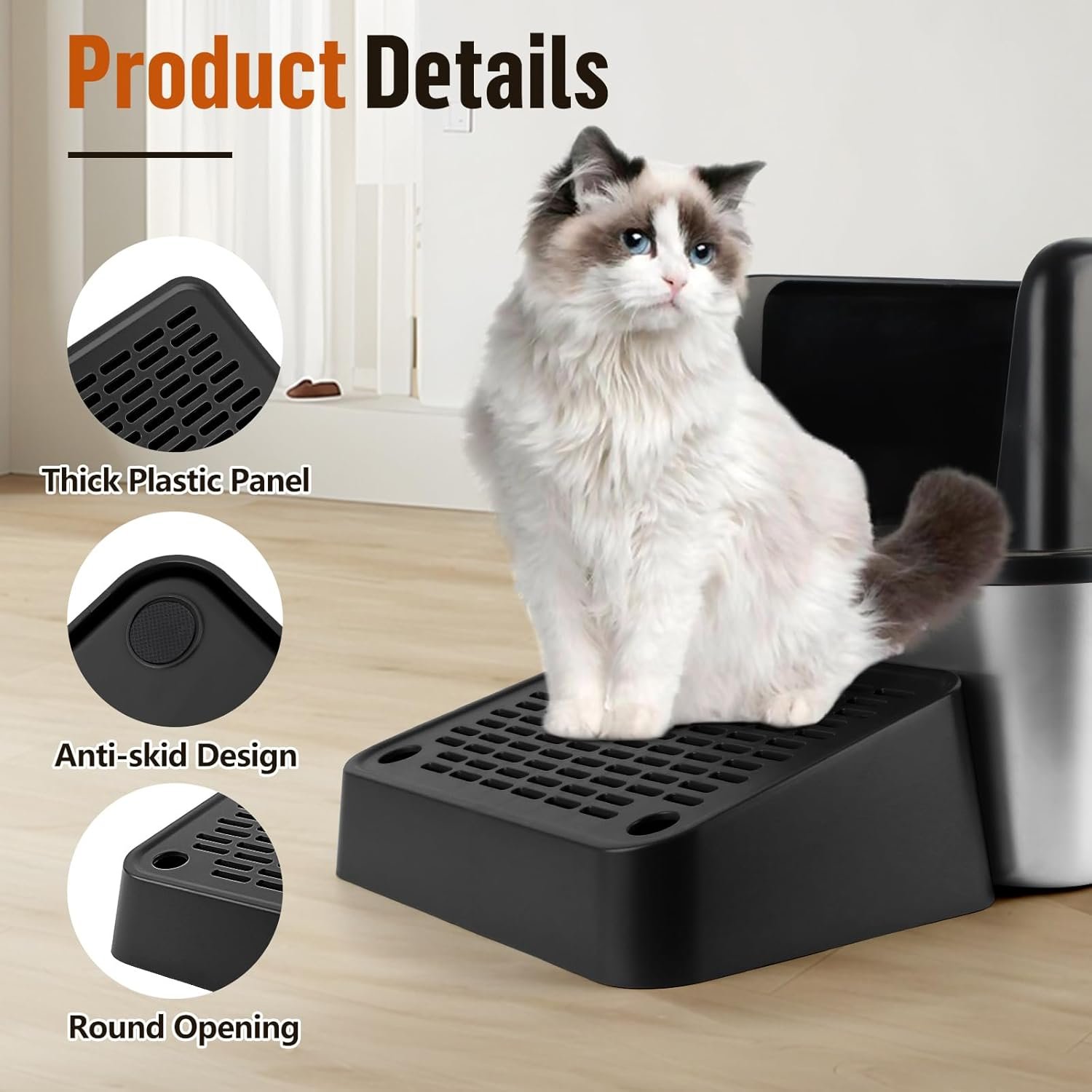 Premium Cat Litter Ramp: The cat litter box step are made of thick plastic, leak-proof, sturdy and won’t break even after long hours of use.4 non-slip stickers prevent movement and the rounded smooth design protects your cat from danger.