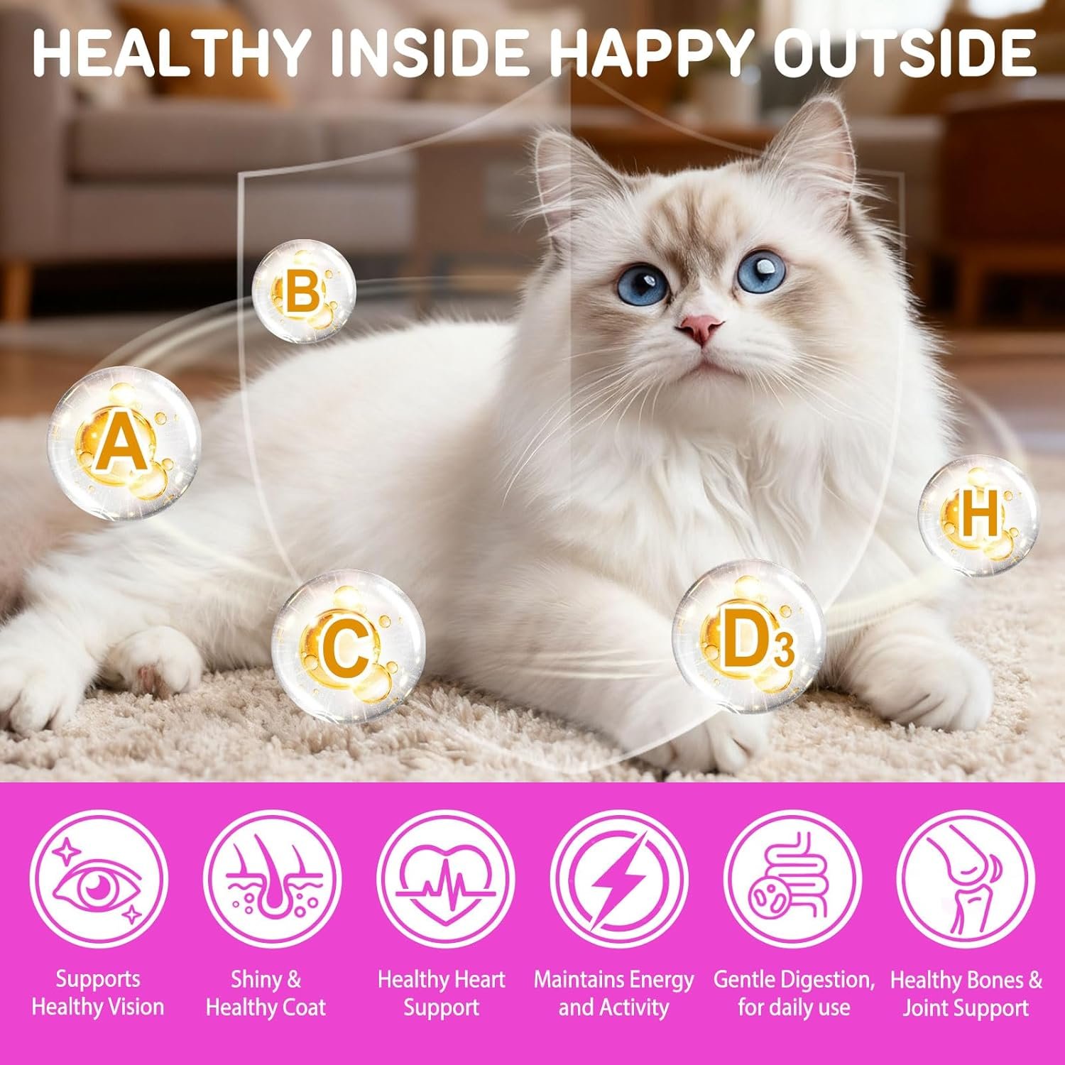 Overall Health for Your Cat: These cat vitamins for cats are packed with powerful nutrients. They support a healthy immune system, skin, coat, and heart. Give your cat a simple daily boost!