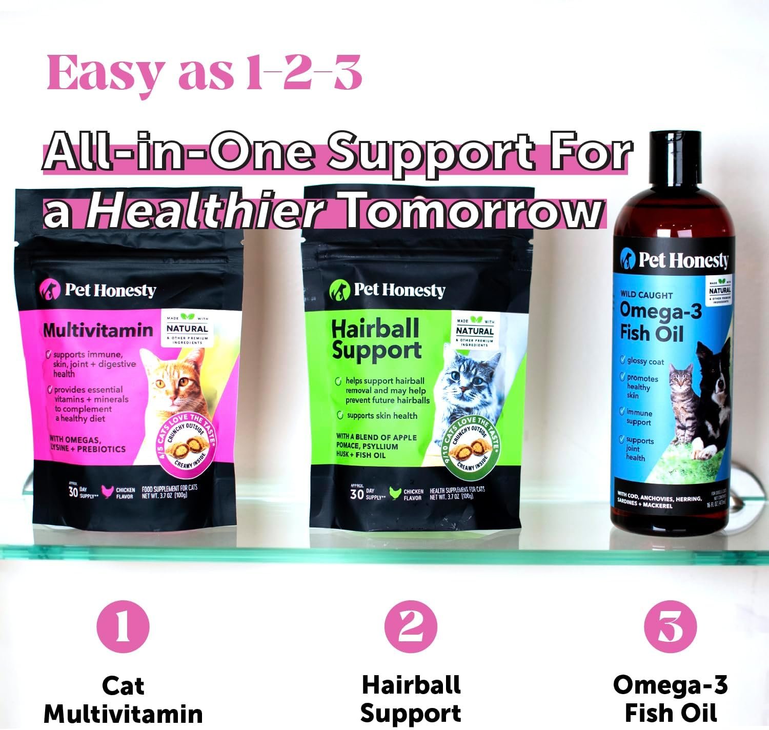 Pet Honesty’s Multivitamin for cats is a delicious, dual-textured supplement that contains essential vitamins, minerals, and nutrients to support your cat’s overall health. Powerful ingredients like Lysine, Beta Glucan, and Omega-3s work together to offer effective support for some of the most important areas of your cat’s health, like their immune system, joints, skin, and digestion. The unique texture format pairs a crunchy outer shell with a creamy, savory filling, offering a taste and texture combination that cats love.