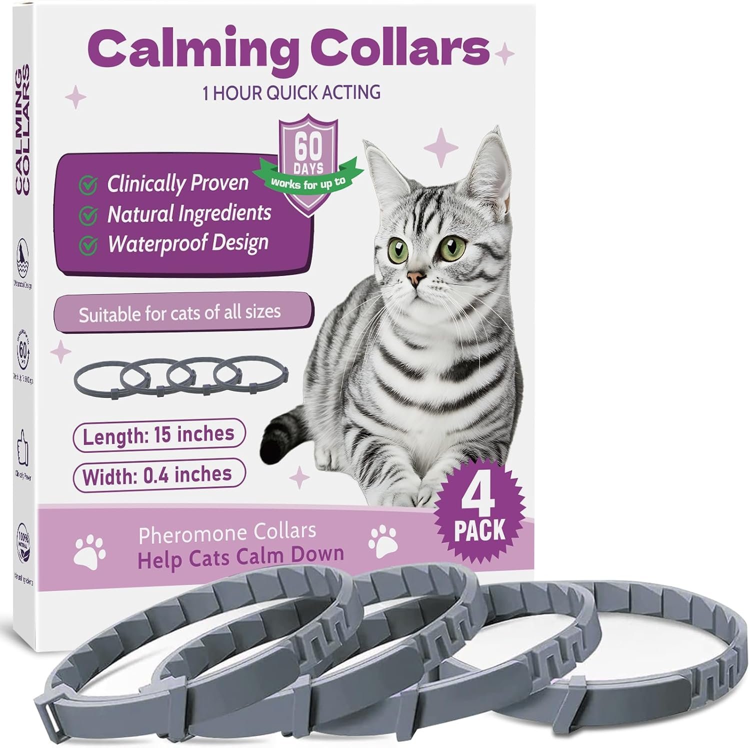 Cat Soothing Collar for Anxiety & Stress Relief, Adjustable Pheromone Band, Rapid Comfort Effect, Drug-Free, Lavender-Free, Natural Formula, 4 Pack -Grey