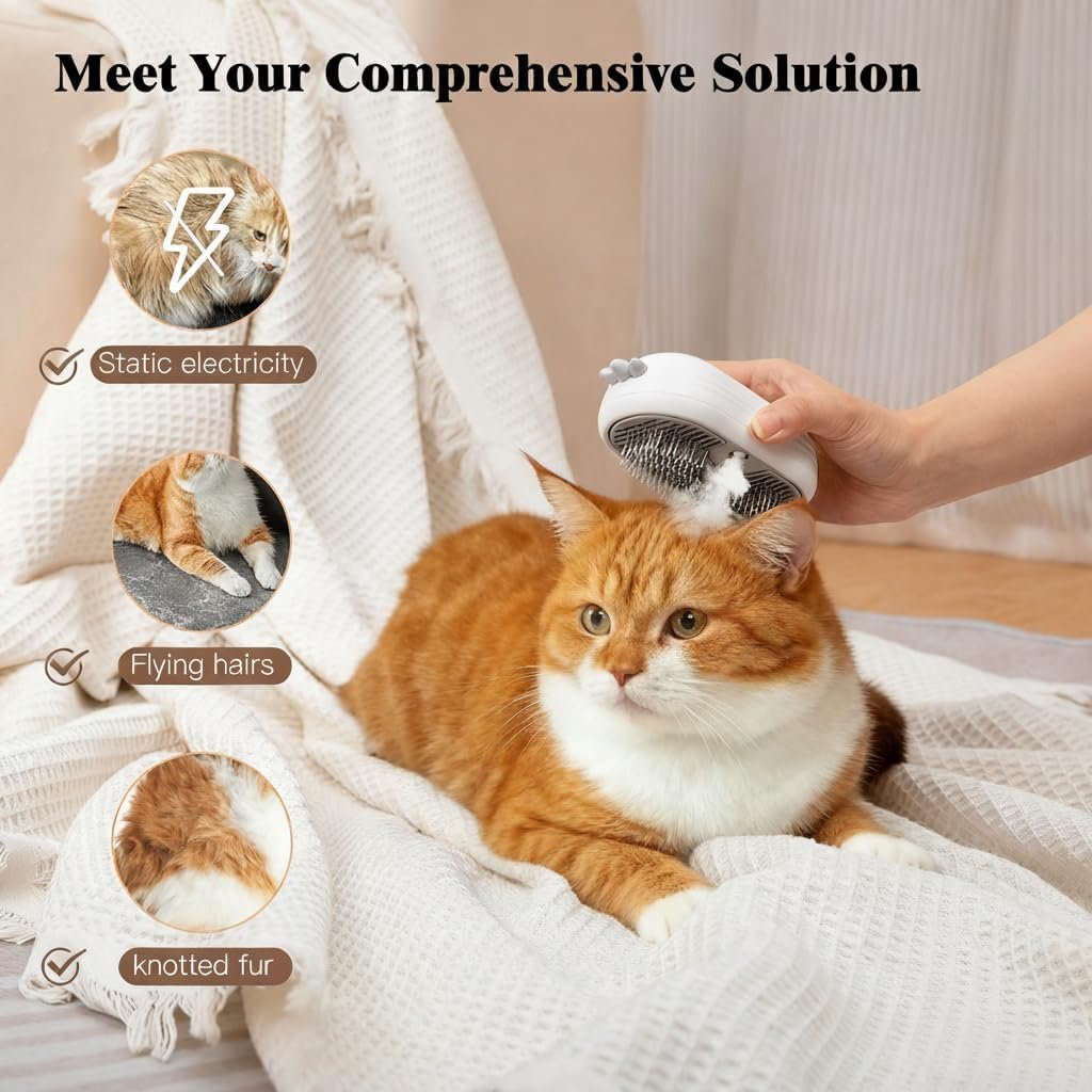 Cat Steam Brush,3-in-1 Cat Brushes for Long&Short Haired Cats,Cat Grooming Brush Easily Removing Loose Hair with One-click Cleaning Button (White)
