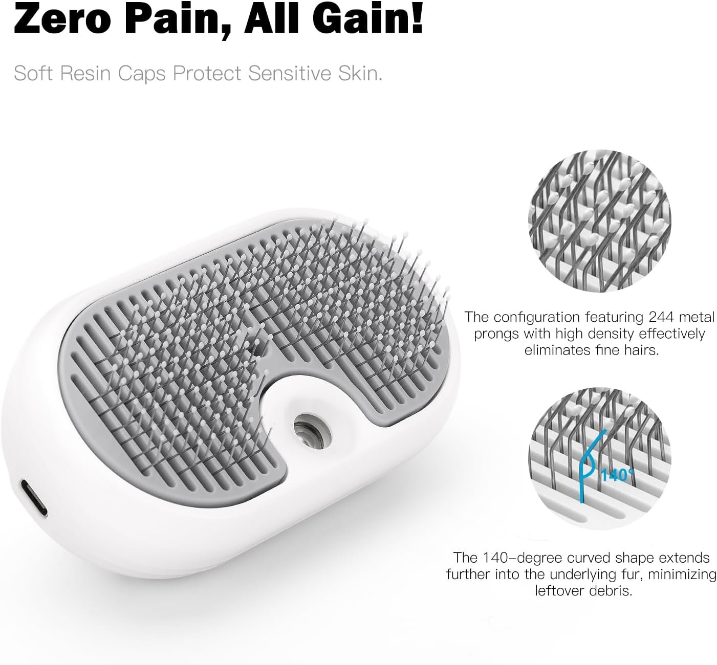 【Skin-Safe Curved Pins】Featuring 244 curved pins with resin-coated tips, this brush gently massages the skin and removes loose undercoat without scratching. Safe for sensitive skin and effective for deep detangling.