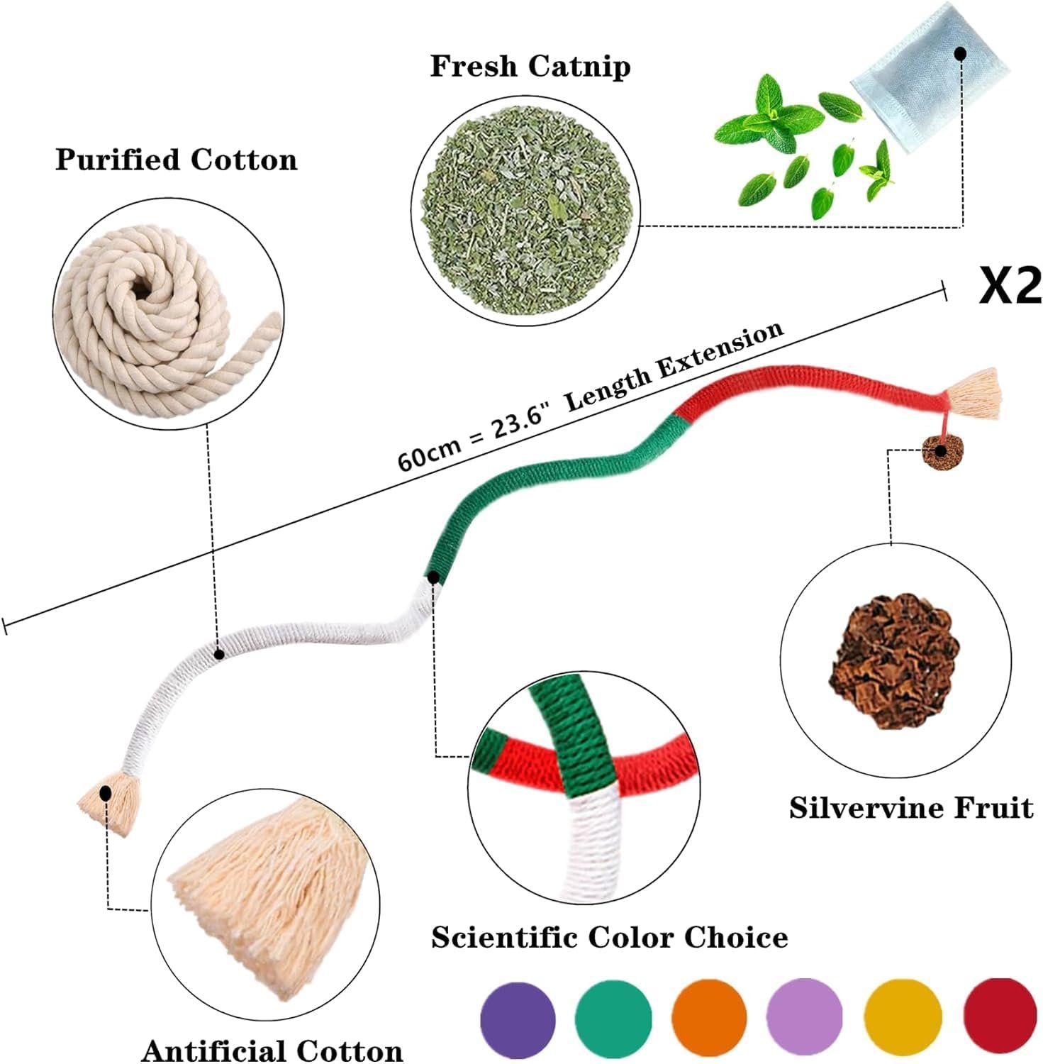 Safe Toy :Cat chew toys are handcrafted from safe, soft organic cotton rope with no metal wires, making them safe for all cats.These soft colorful ropes provide enriching quiet playtime without bothering cat owner’s sleep or life. Your kitty will love the funny snake-like shapes, enhancing their playtime with every pounce and bite. Paired with a reusable catnip pouch, cat toy provide cats with joyful play that’s both entertaining and safe