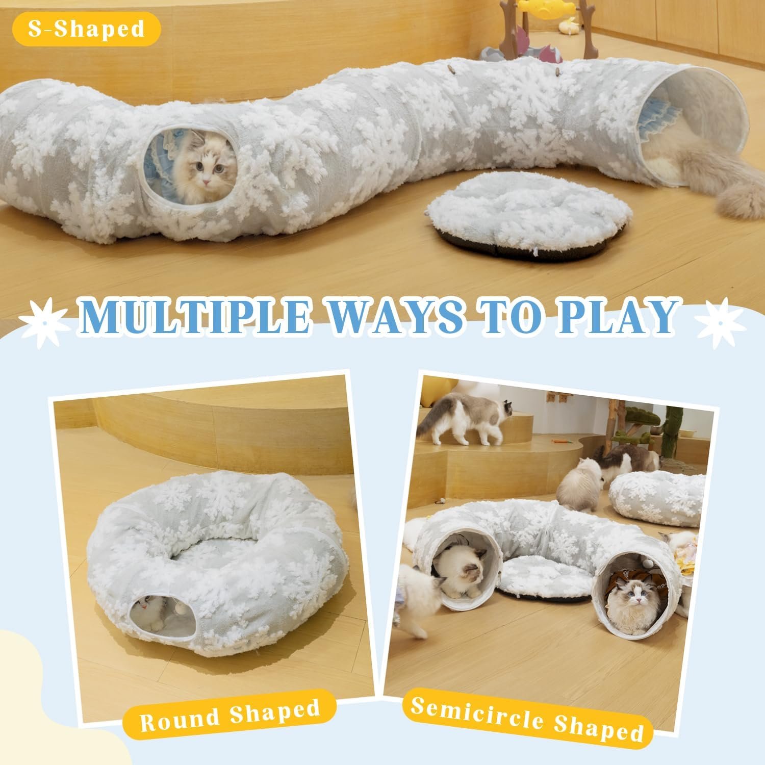 3 in 1 Versatile Cat Tunnel: Cat bed tunnel consists of two semi-circular tunnels and a round soft cushion. Cat tunnel bed can be shaped into an S-shape, circle, or semi-circle. Hanging ball toys and peepholes giving your cat various ways to play and explore