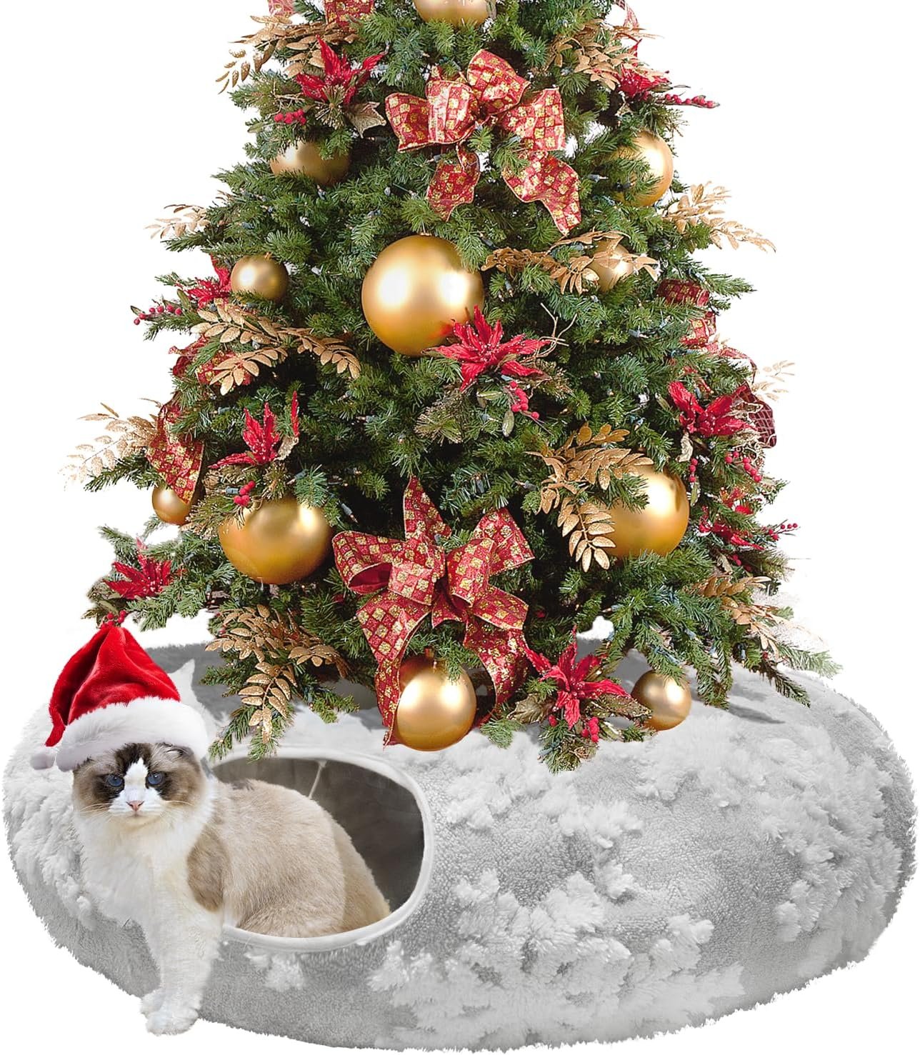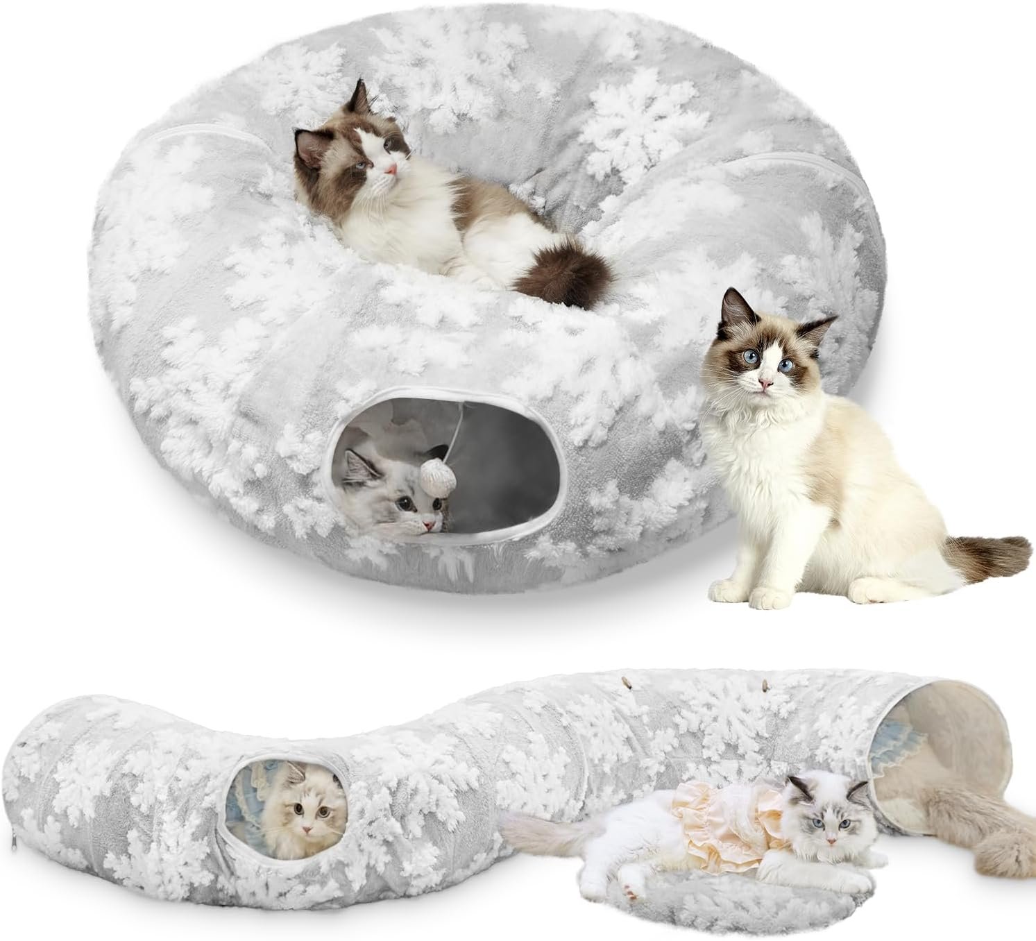 Cat Tunnel with Cat Bed for Indoor Cats, 3 in 1 Cat Donut Tunnel with Central Soft Mat and Dangling Balls, Christmas Cat Tube Toys Fun for Kitten, Puppy, Ferret, Rabbit