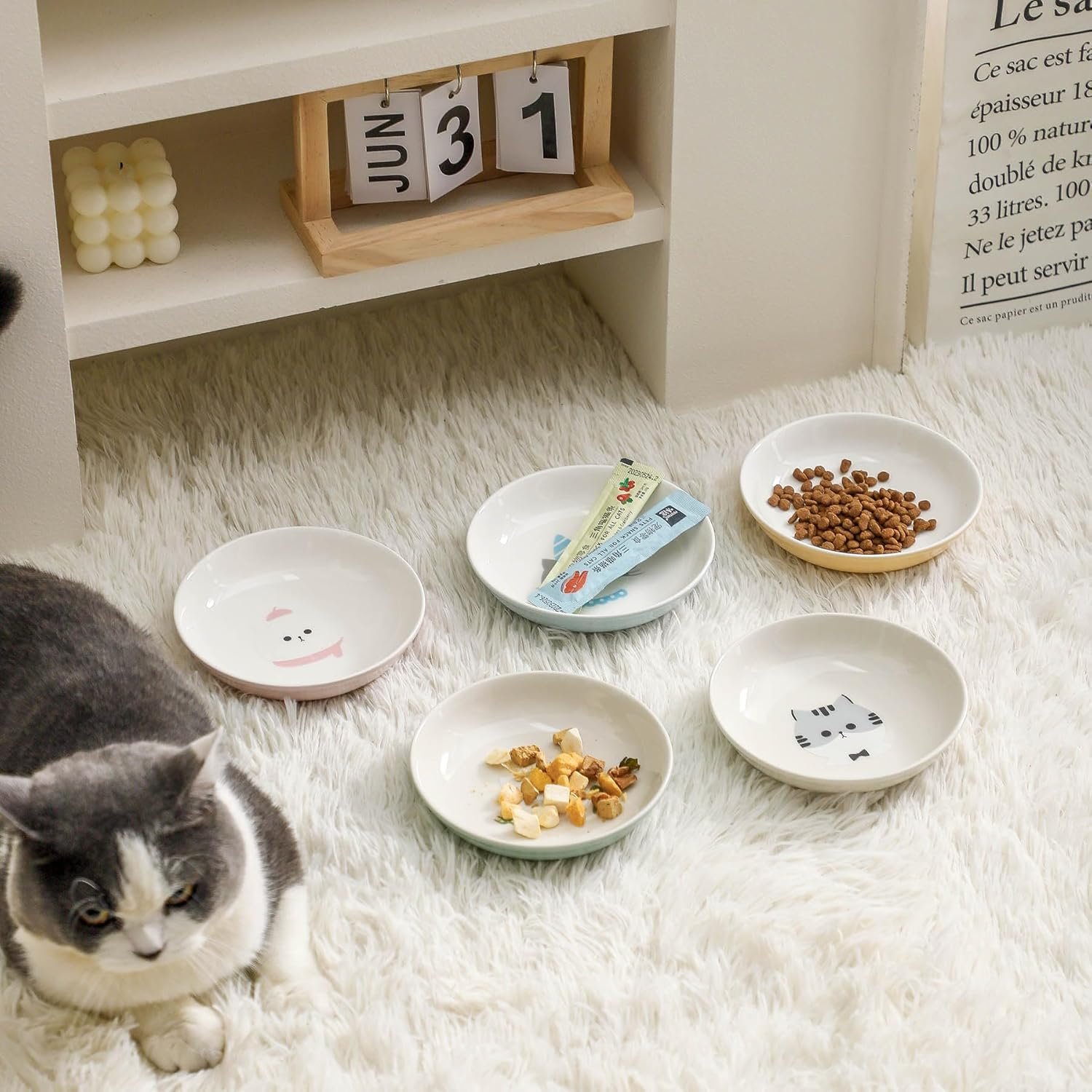 Ceramic Cat Bowls Set – 5.5 inch Wide Cat Food Bowls Whisker Fatigue Friendly, 5 Colorful Kitten Dish Plates with Cute Pattern for Wet and Dry Food Water