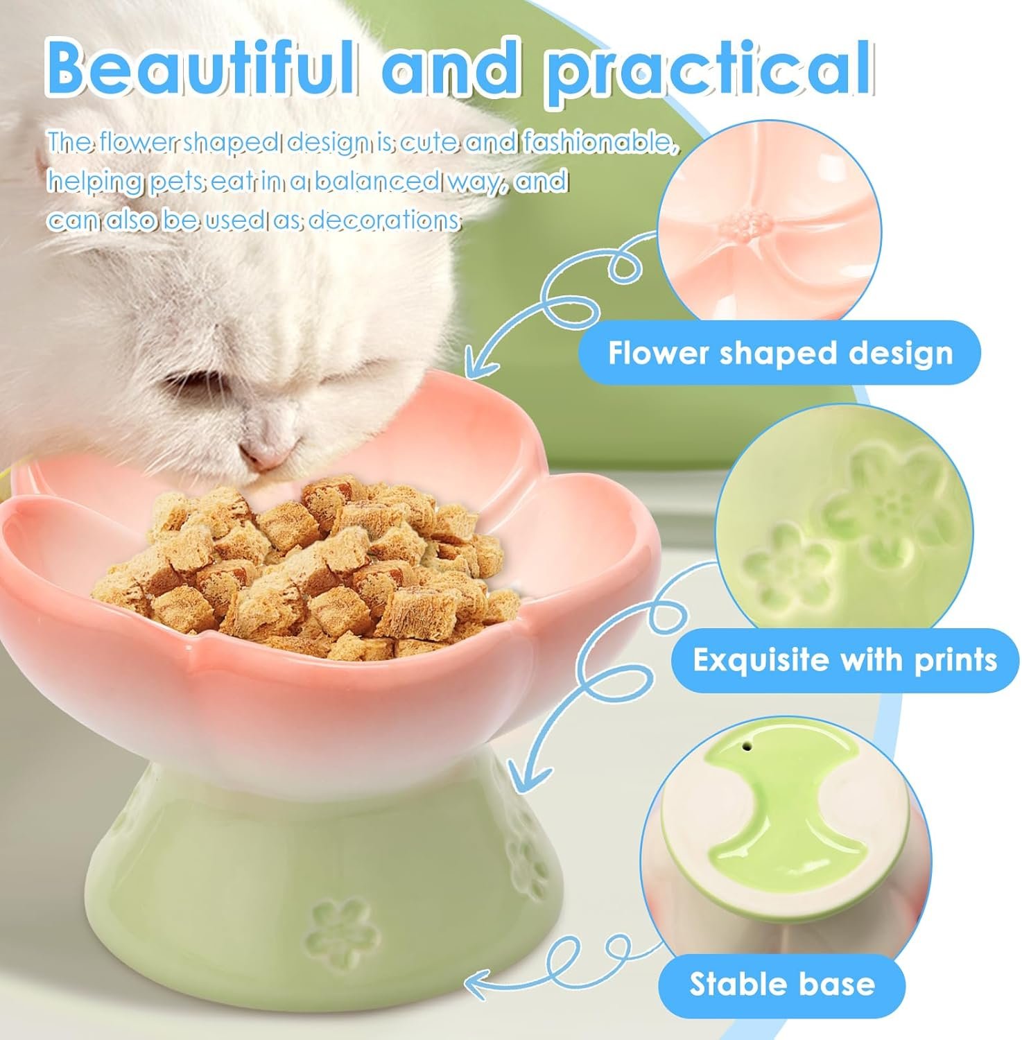 【Stylish & Beautiful】The flower shape design of this feeding bowl is both cute and stylish, the appearance is a gradient color design, which will make the animals feel happy and it is also a bright color in the home. which not only helps pets eat in a balanced way, but also serves as a decorative item to decorate your home environment, with a sophisticated appearance and a warm and harmonious ambiance to your home.