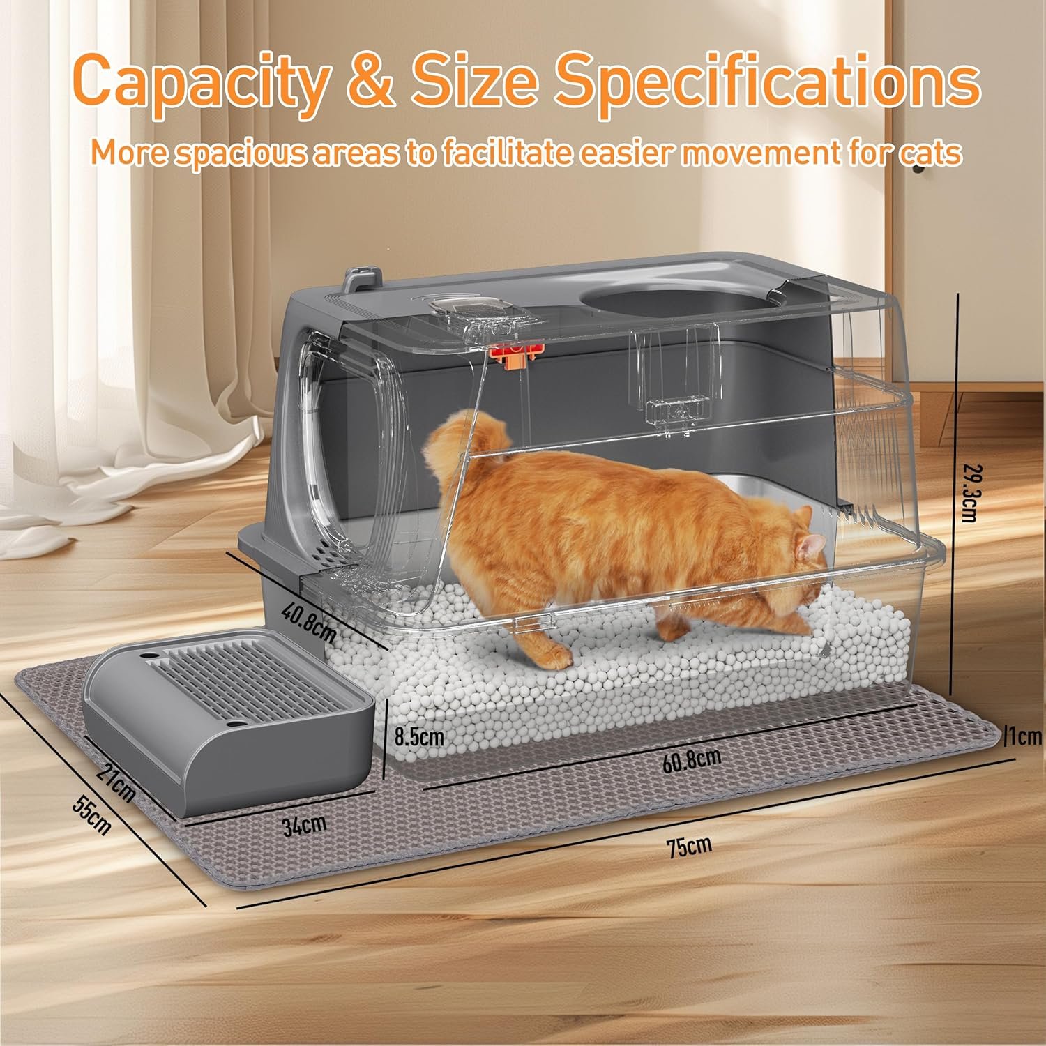 Complete Accessory Set for Effortless Maintenance: Included are three essential accessories: a non-slip tracking guard (75x55cm mat) to protect floors, a litter scoop for daily cleanups, and a step-in footpad designed with gaps to catch scattered litter, maintaining a clean and tidy space.