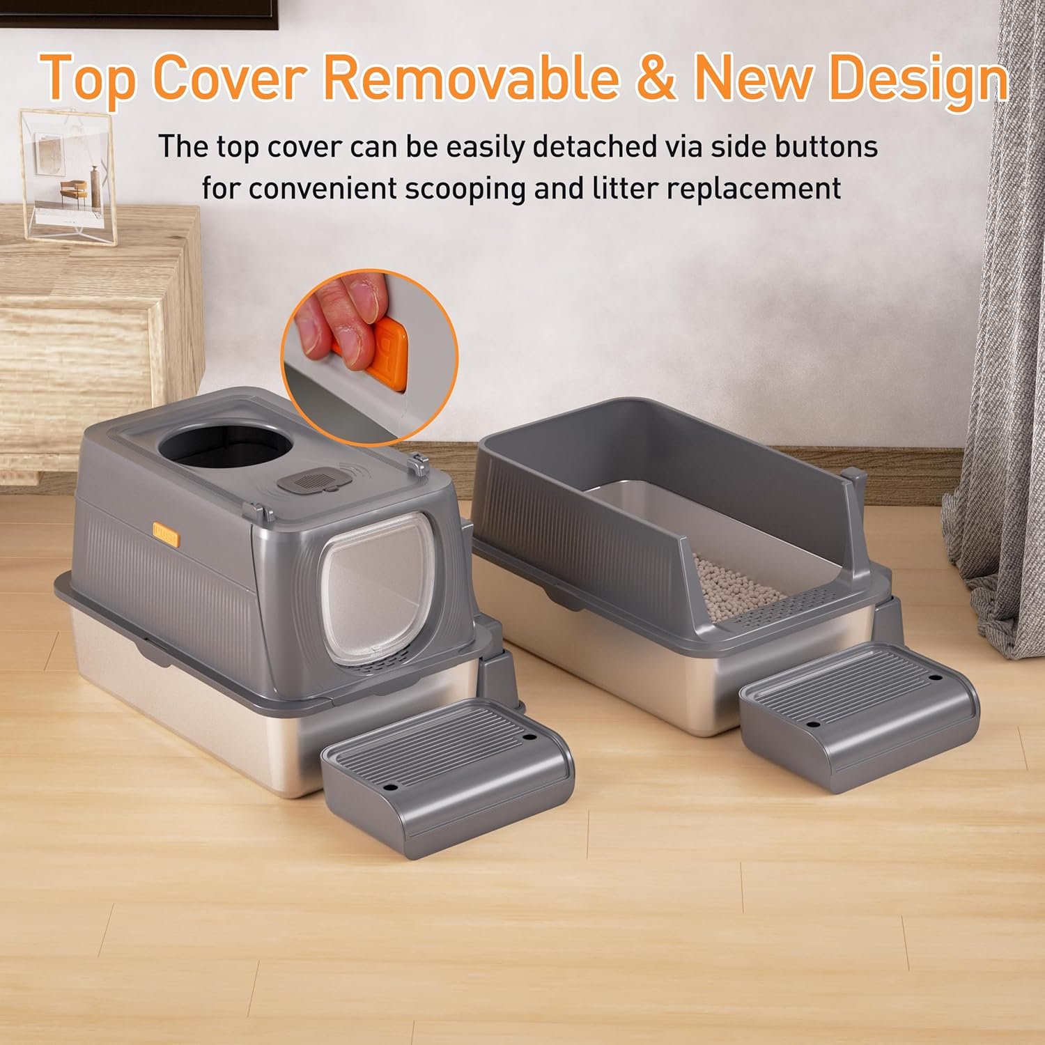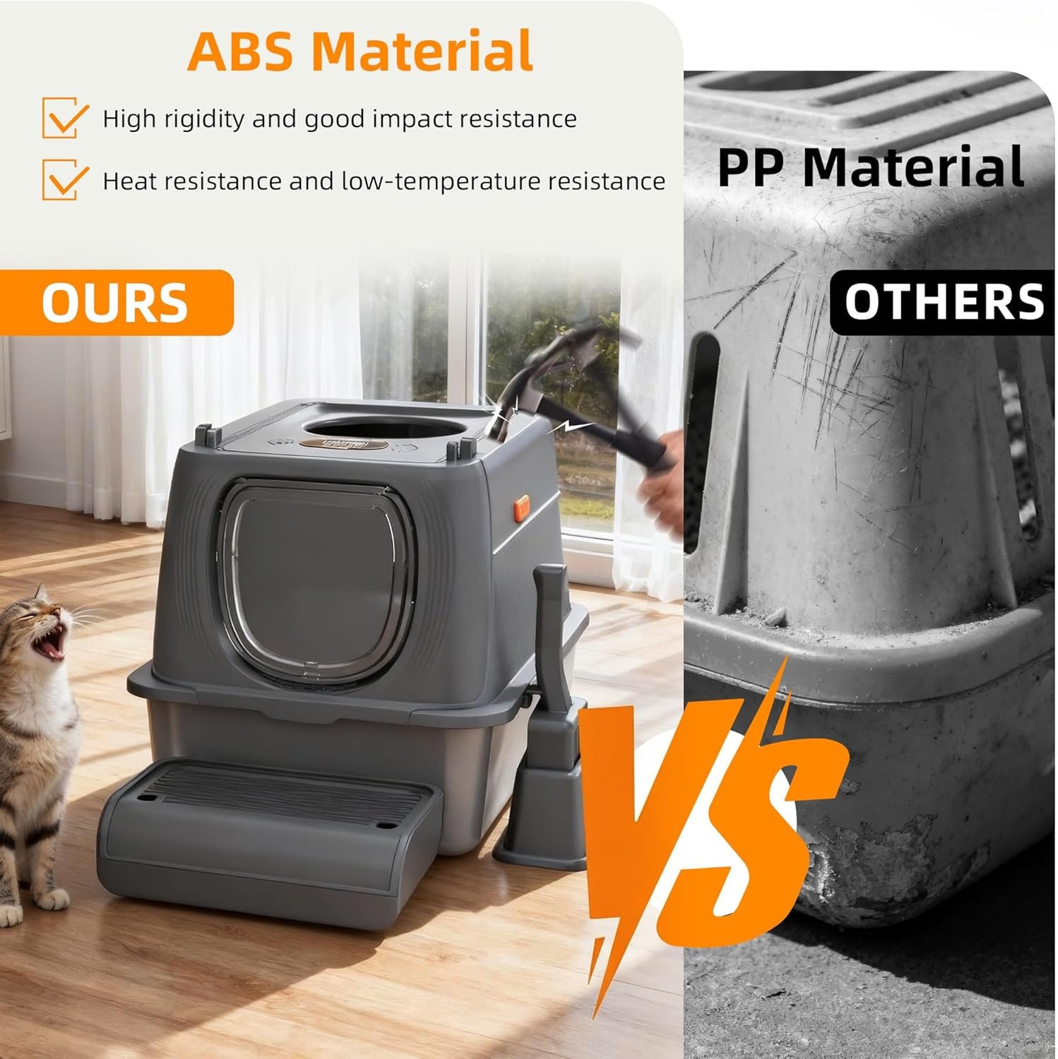 ABS and premium rust-resistant stainless steel construction: Crafted from durable, high-quality stainless steel and ABS, this litter box stands apart from ordinary materials with superior impact resistance and extended lifespan.