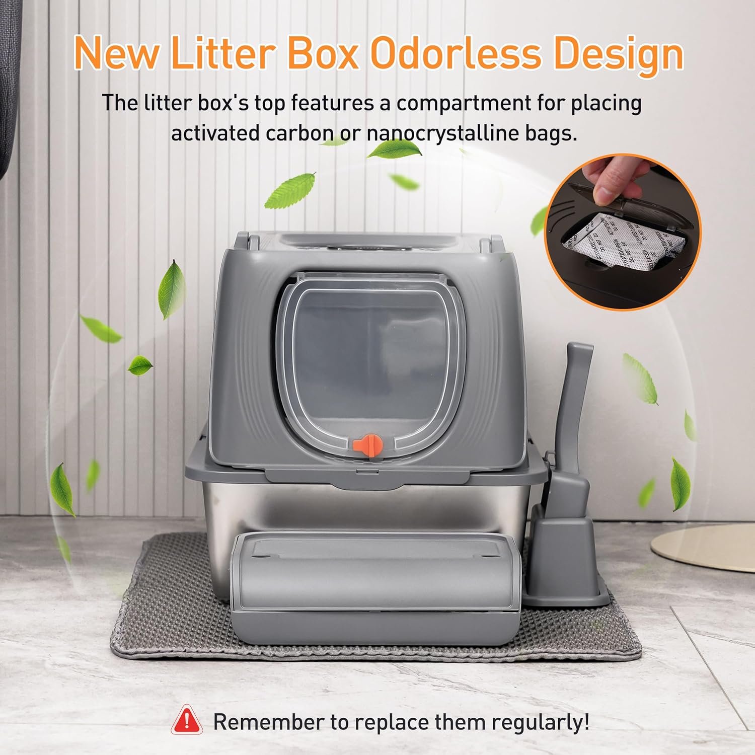 Advanced Odor Control & Air Purifier Compatibility: Our stainless steel construction naturally resists odor retention, and the litter box is designed to accommodate nanocrystalline or activated carbon bags (sold separately) for an additional layer of freshness and air purification.