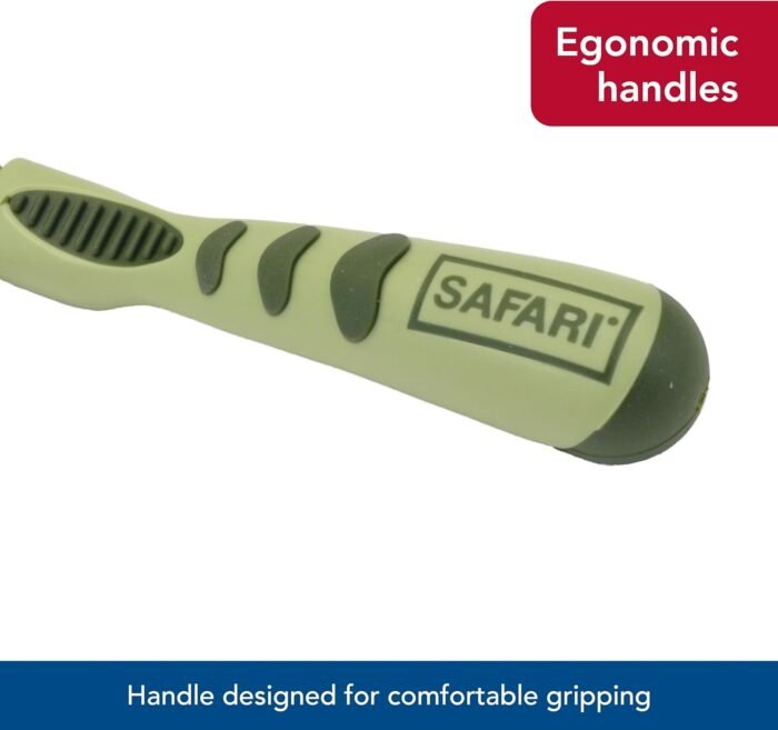 The Safari Dog De-Matting Comb removes mats and tangles from your dog’s coat. The stainless steel, serrated blades will comb out most tangles. The De-Matting Comb can be used on most medium to longhaired dogs. It is especially helpful on coarse or long, matted coats.