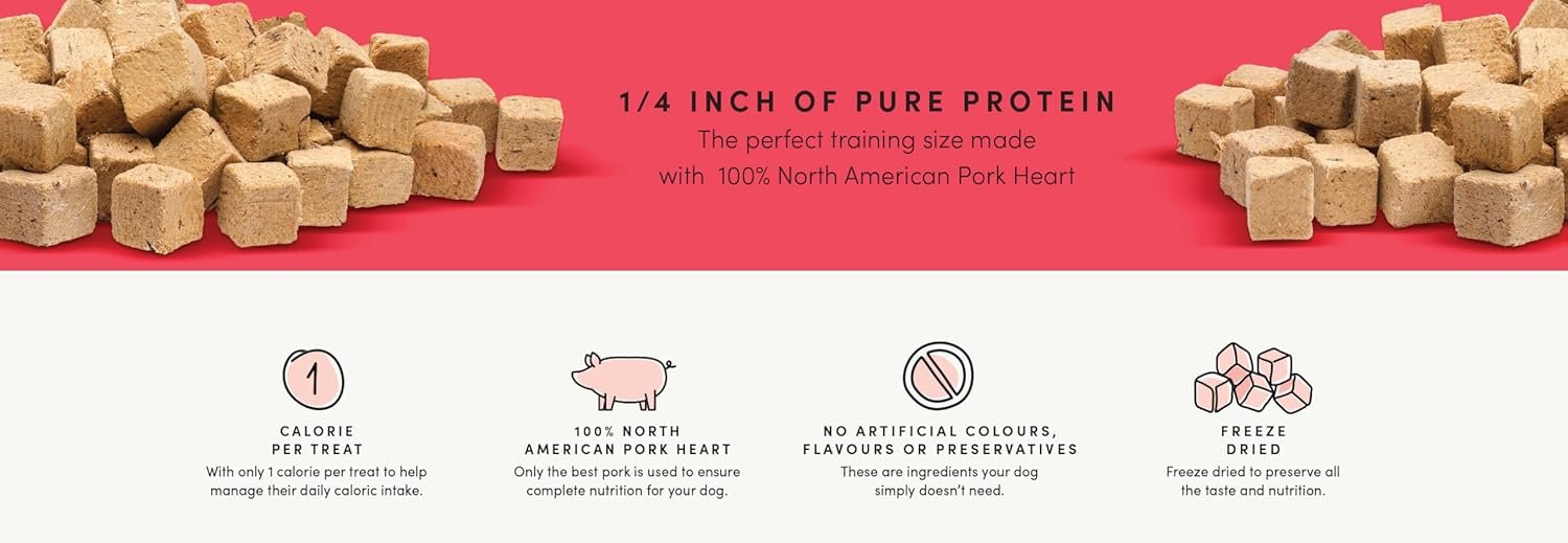 Fuel your dog’s training sessions with ¼ inch of pure protein. These single ingredient, North American freeze-dried Pork Hearts contain essential B vitamins, zinc and iron which keep your whole dog healthy and happy. Each bite sized morsel is only 1 calorie, making them ideal for the repetitive rewards required during training. Whether you’re working on “sit” and “stay” or teaching new tricks, these delicious, crunchy Mini Trainers are sure to motivate your pup to learn and grow.